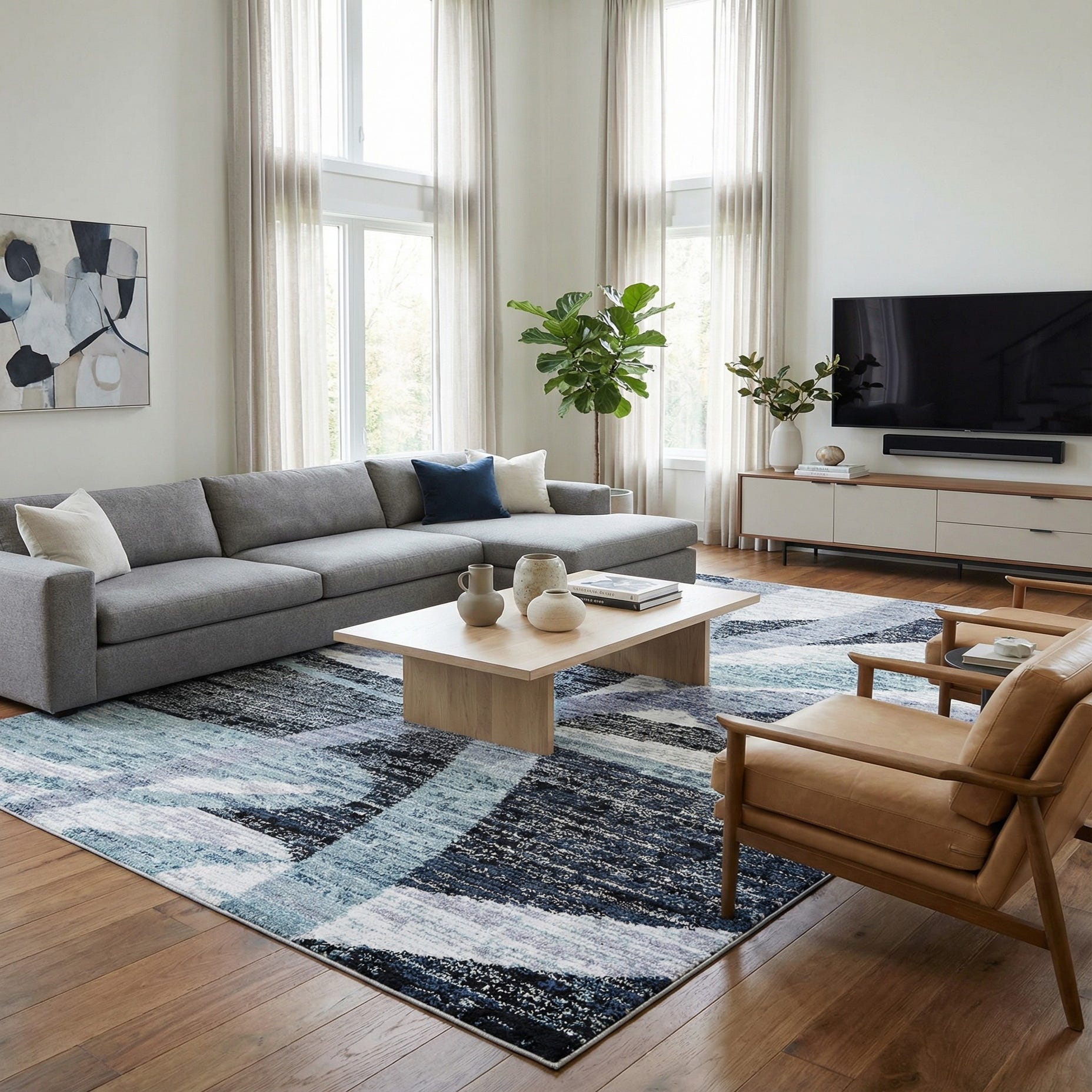 Primary color is Gray and Ivory. Colors in this rug include: Gray and Ivory, Blue, Light Blue, Navy Blue.