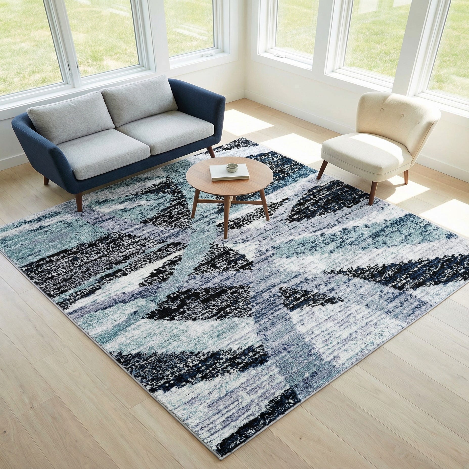 Primary color is Gray and Ivory. Colors in this rug include: Gray and Ivory, Blue, Light Blue, Navy Blue.