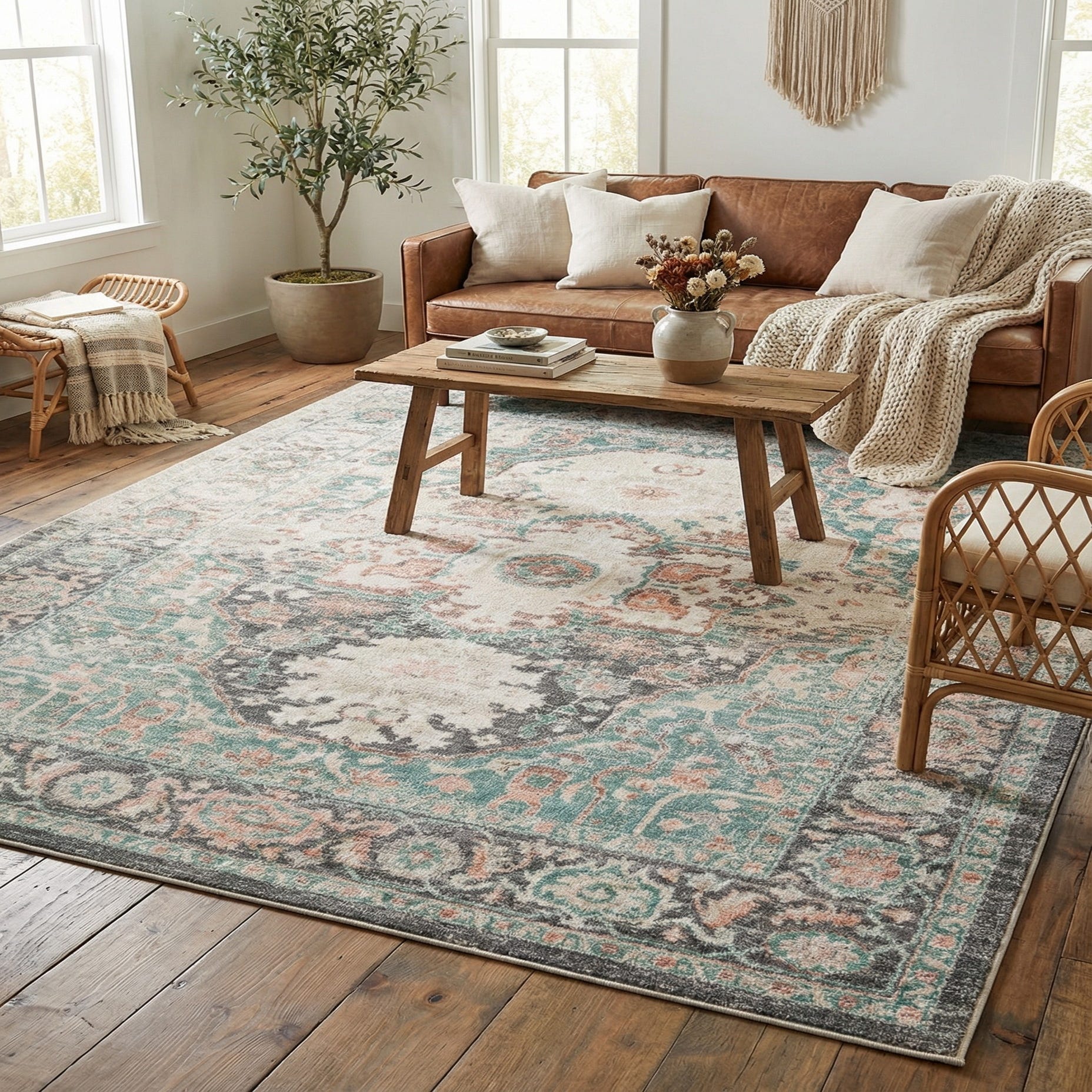 Primary color is Gray and Sage Green. Colors in this rug include: Gray and Sage Green, Ivory, Pink.