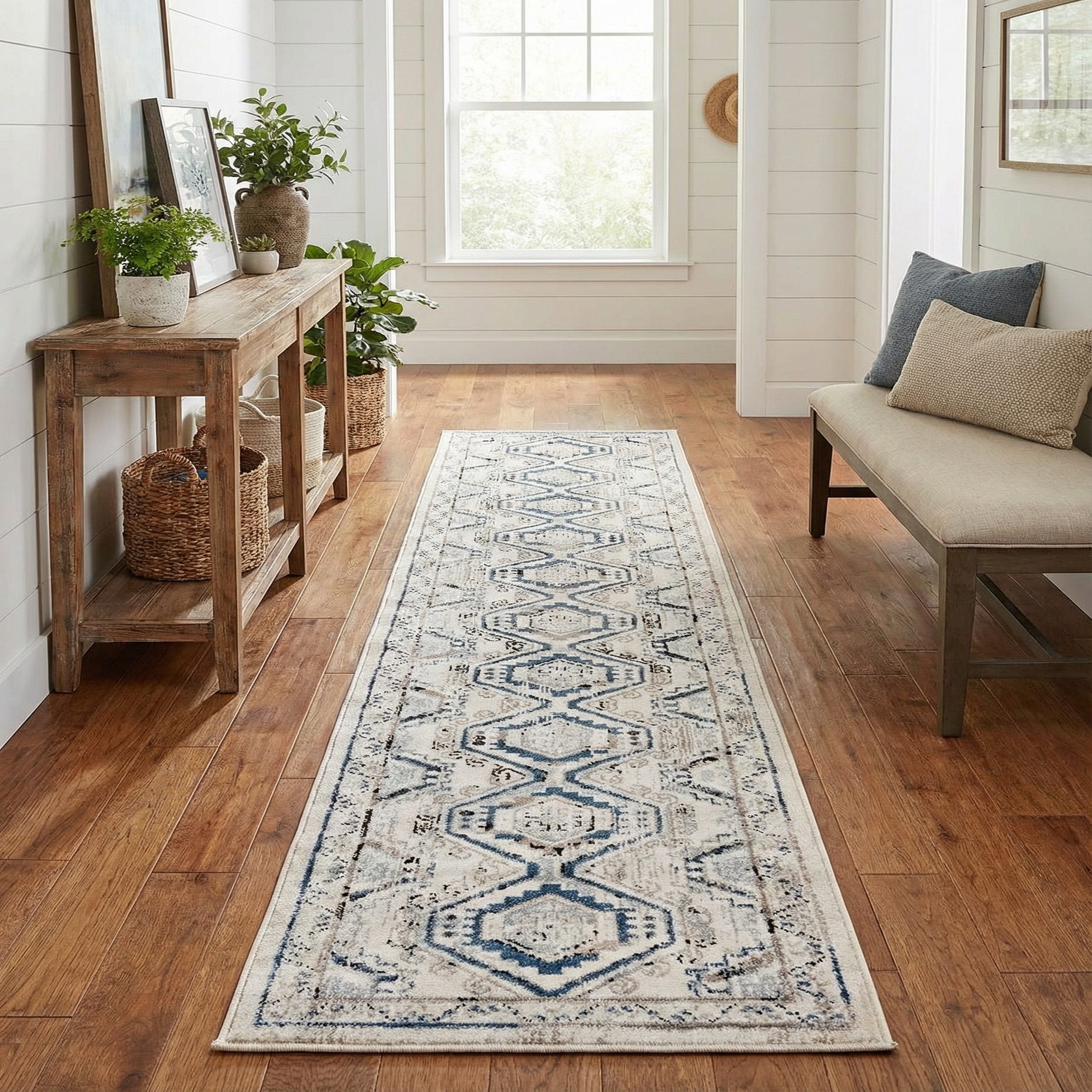 Primary color is Gray Blue. Colors in this rug include: Gray Blue, Brown, Ivory, Light Blue.