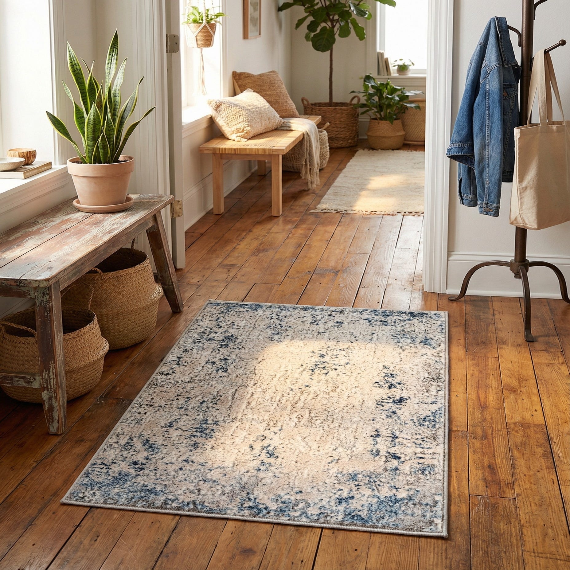 Primary color is Gray Blue. Colors in this rug include: Gray Blue, Ivory.