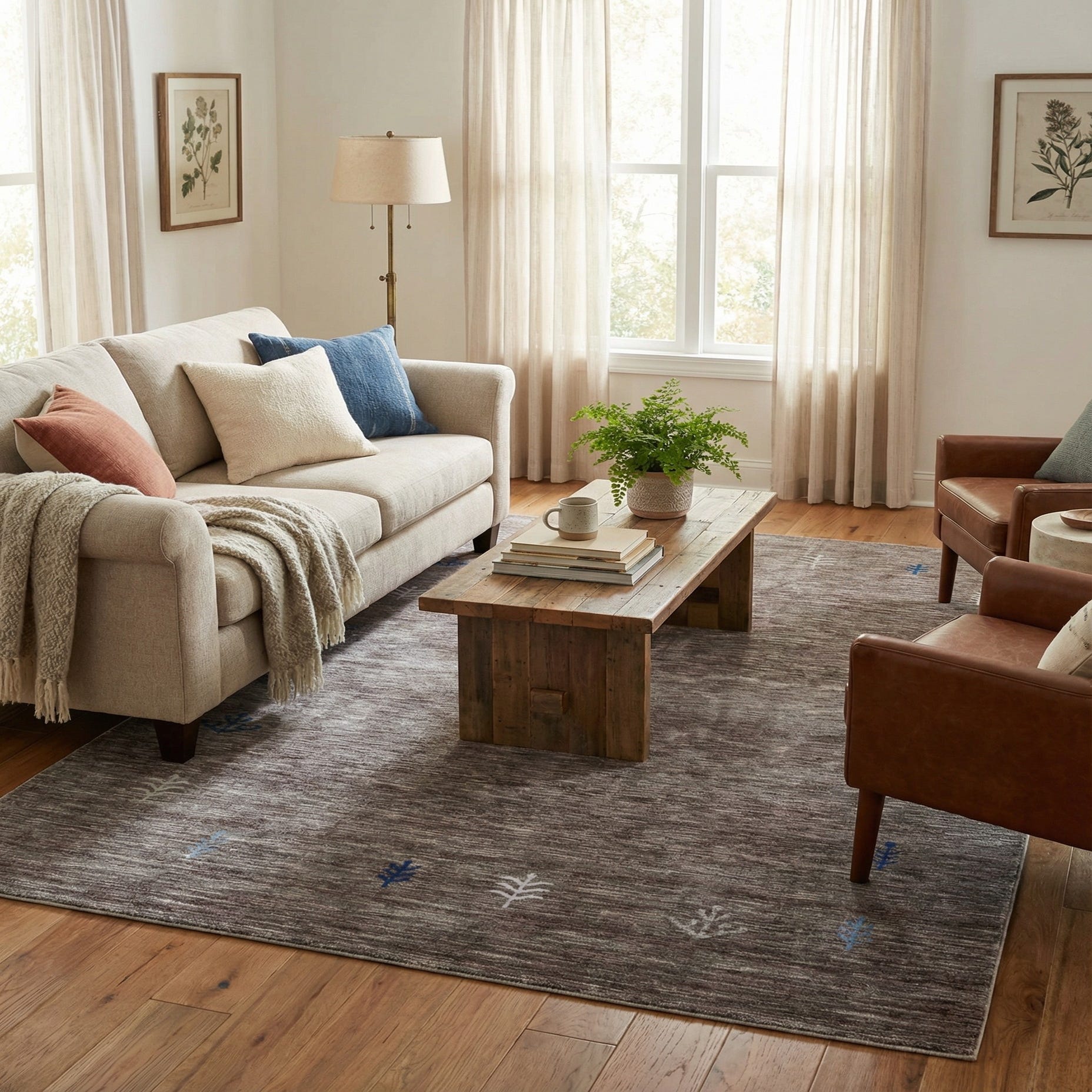 Primary color is Gray Brown. Colors in this rug include: Gray Brown, Ivory, Light Blue, Navy Blue.