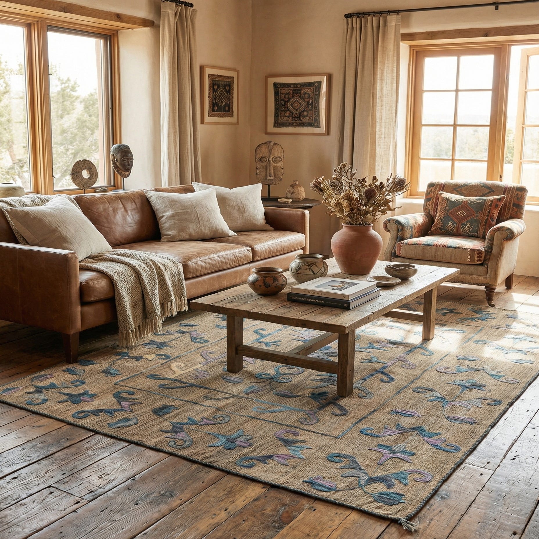 Primary color is Gray Brown. Colors in this rug include: Gray Brown, Blue, Gray, Light Blue, Purple, Ivory.