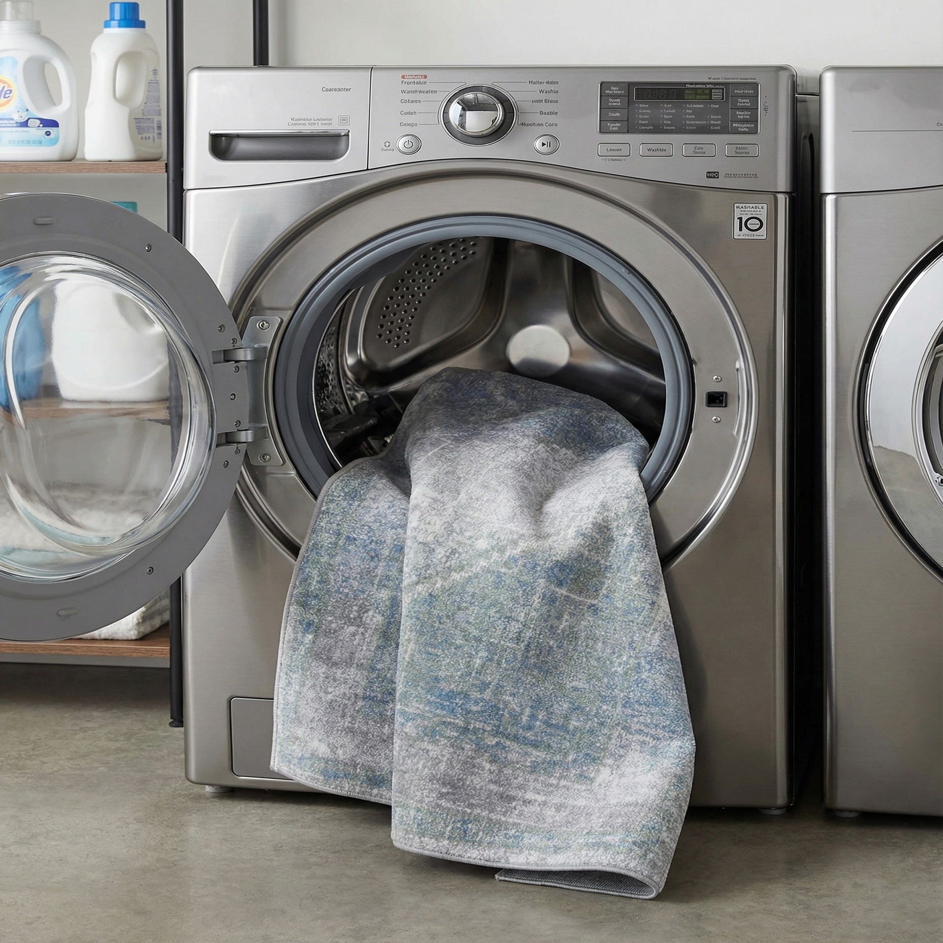 Primary color is Gray Green. Colors in this rug include: Gray Green, Blue, Ivory.