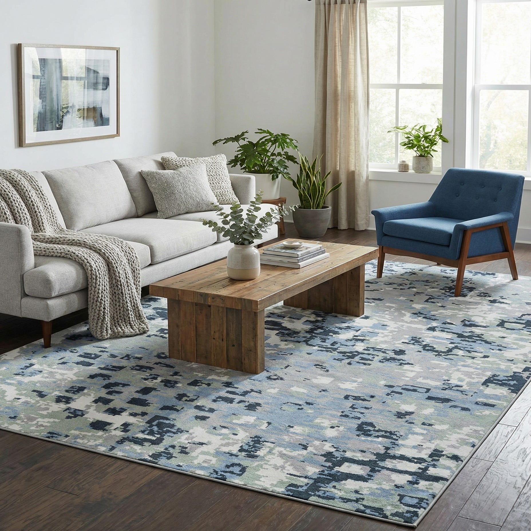Primary color is Gray Navy Green. Colors in this rug include: Gray Navy Green, Ivory, Light Blue.