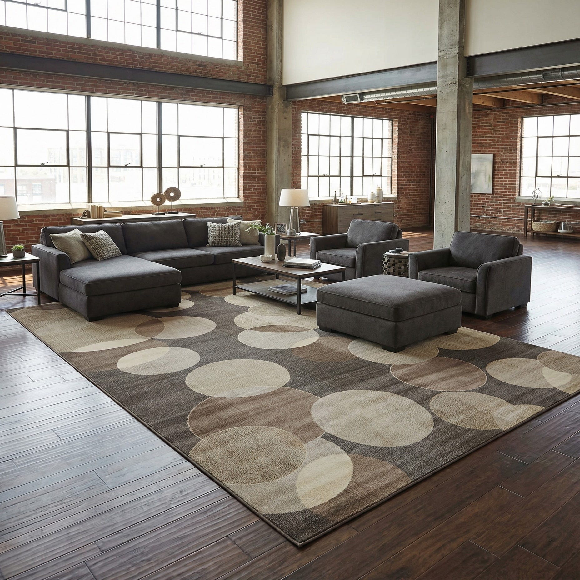 Primary color is Gray. Colors in this rug include: Gray, Beige, Brown, Cream.
