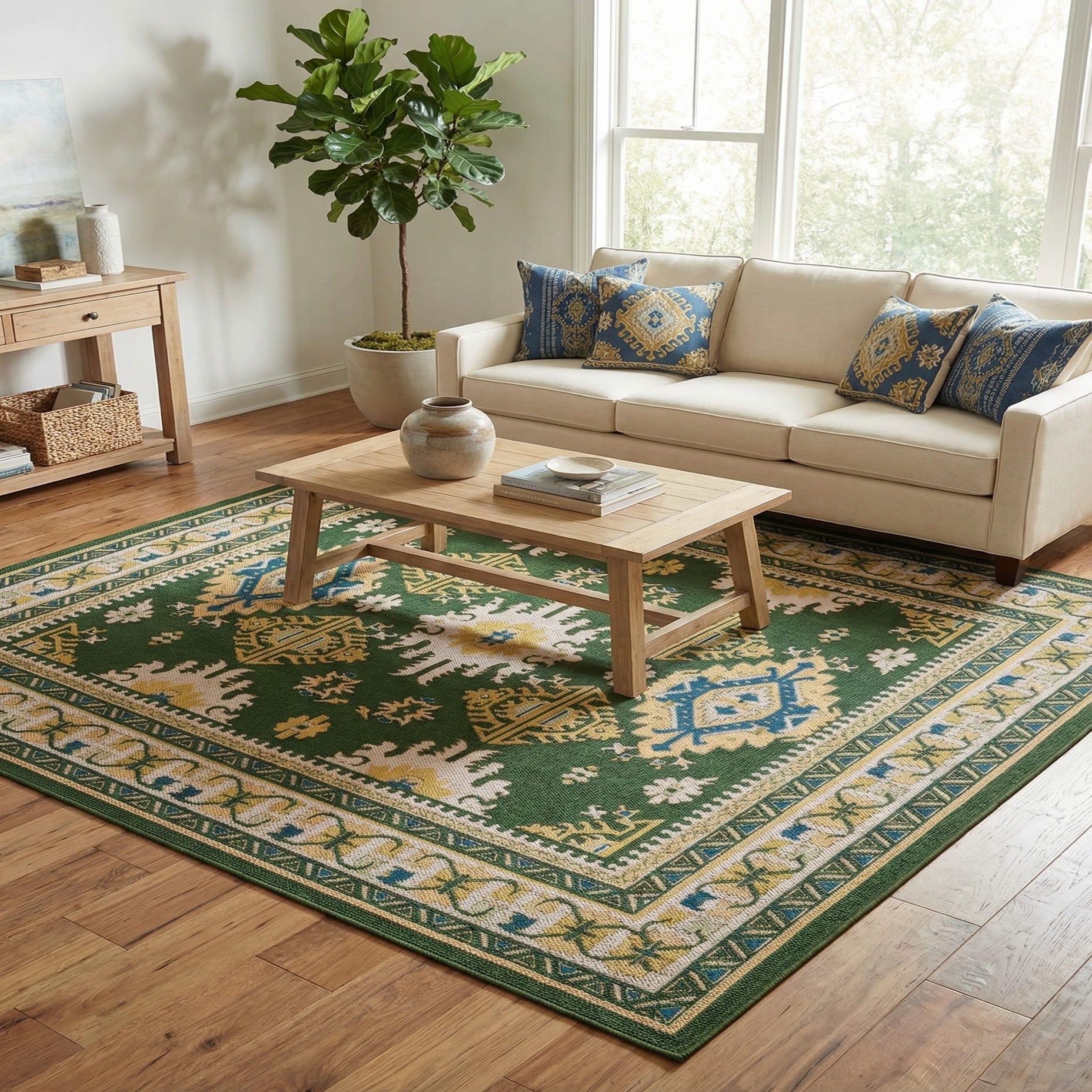 Primary color is Green. Colors in this rug include: Green, Yellow, Black, Blue, Ivory.