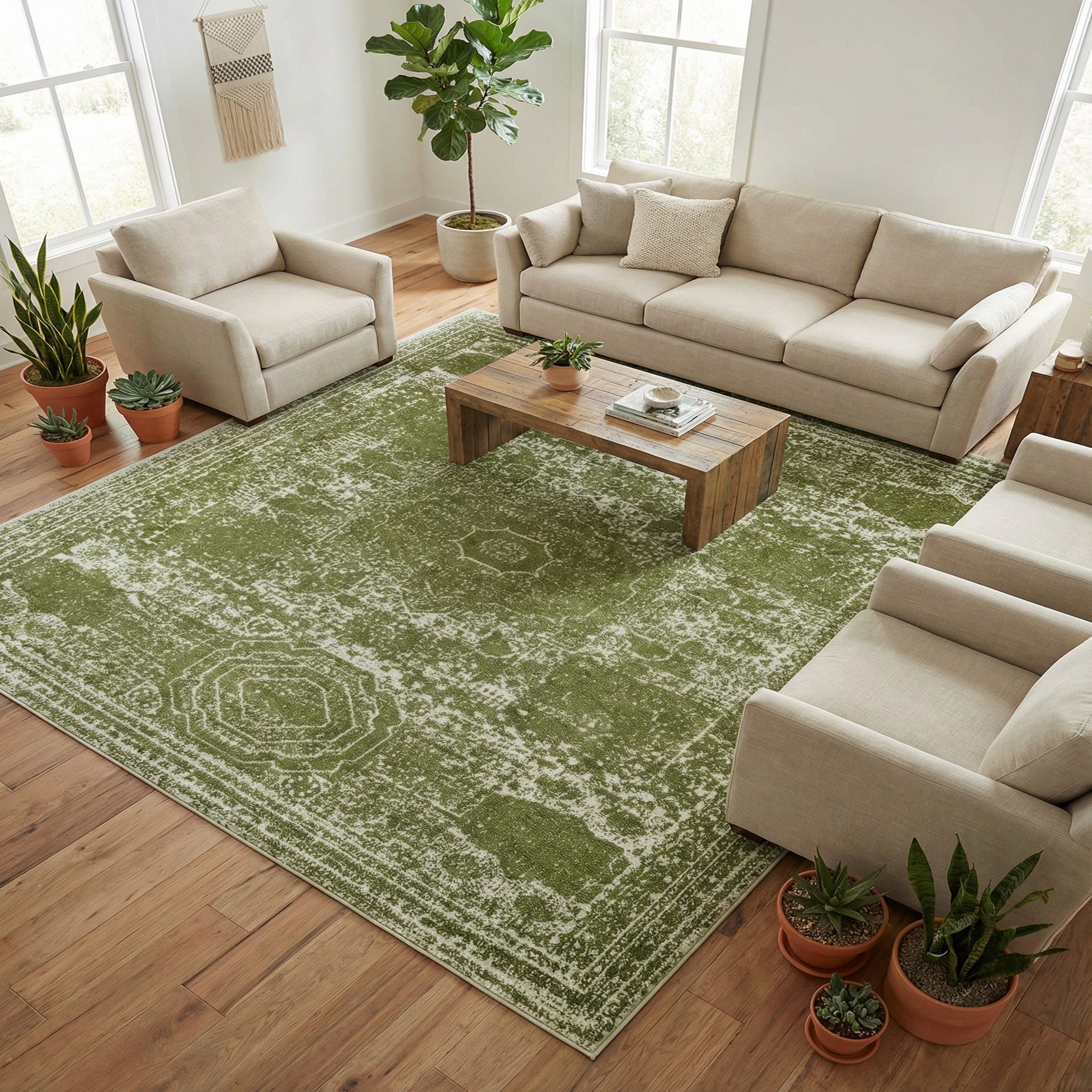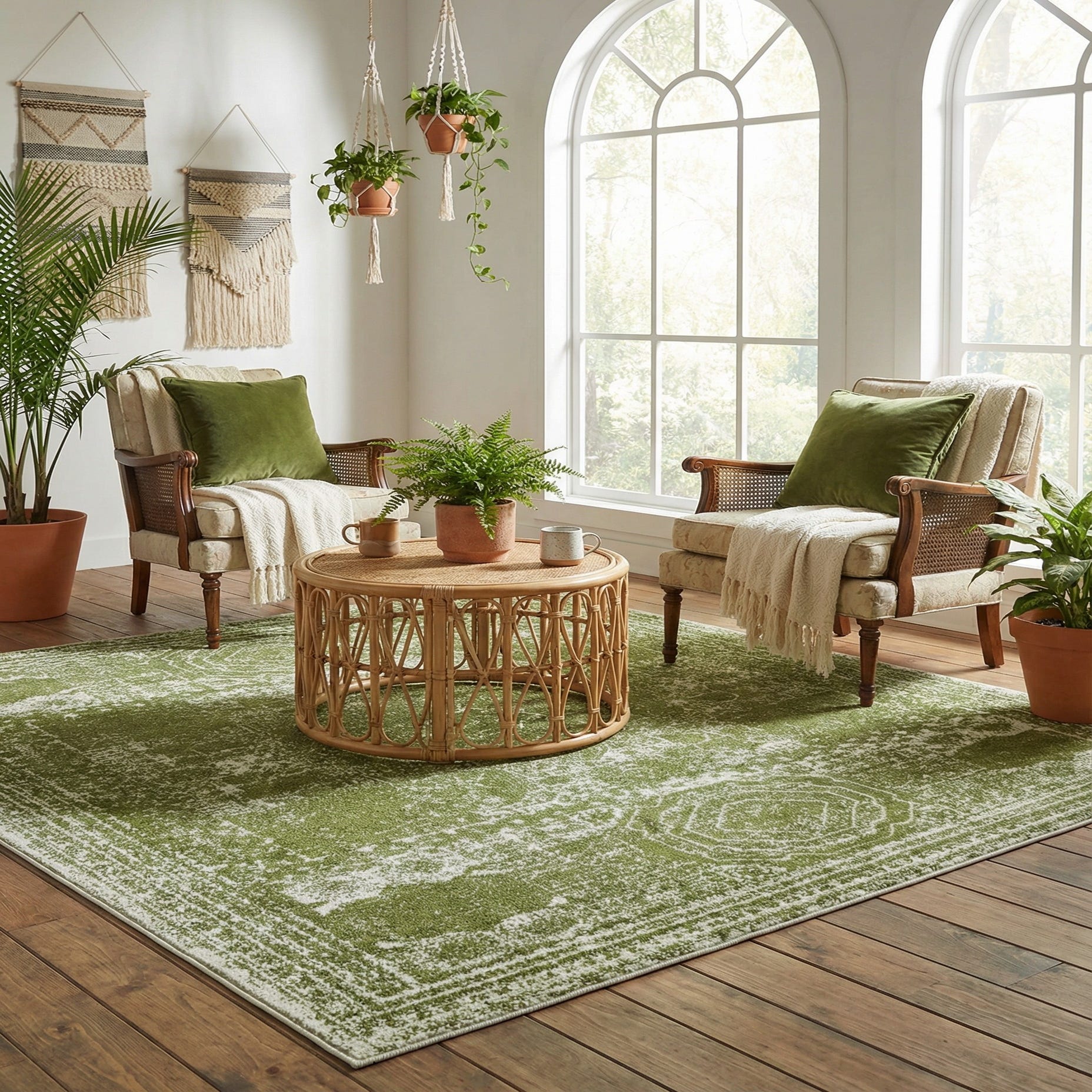 Primary color is Green. Colors in this rug include: Green, Ivory.