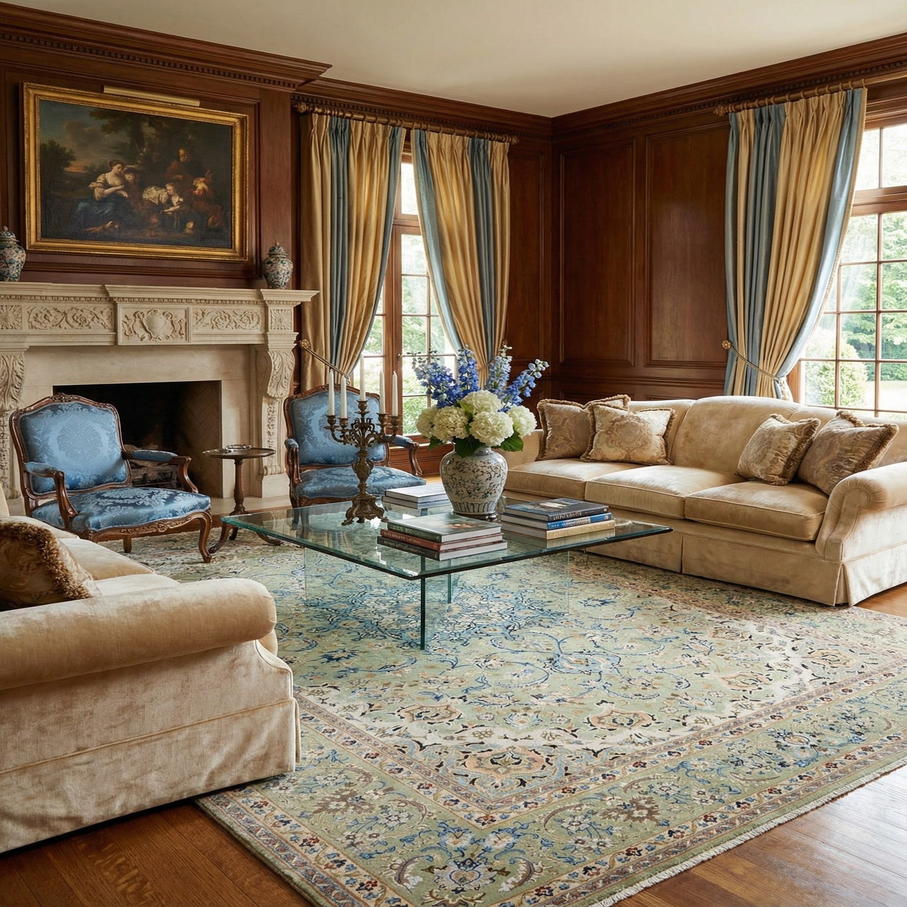 Primary color is Green. Colors in this rug include: Green, Blue, Brown, Dark Blue.