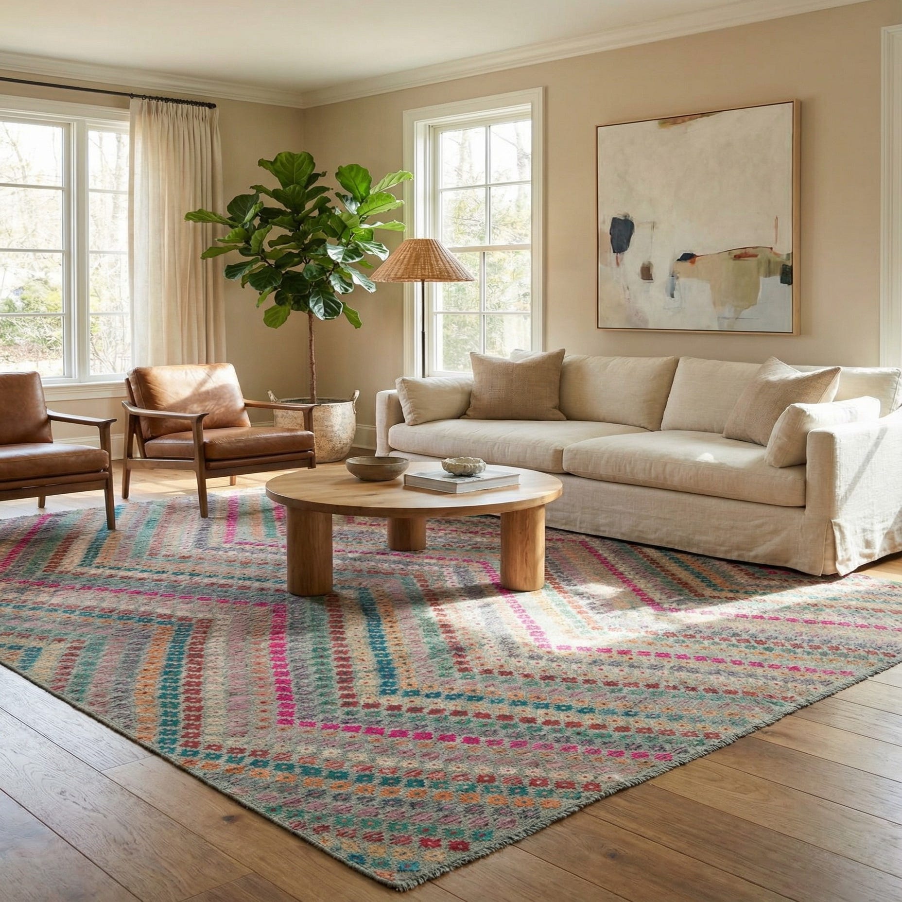Primary color is Green. Colors in this rug include: Green, Beige, Brown, Orange, Red, Pink, Violet.
