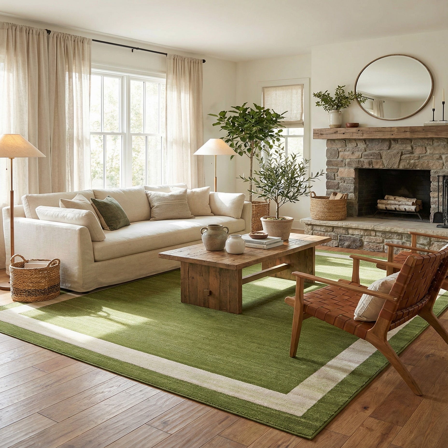 Primary color is Green. Colors in this rug include: Green, Ivory.