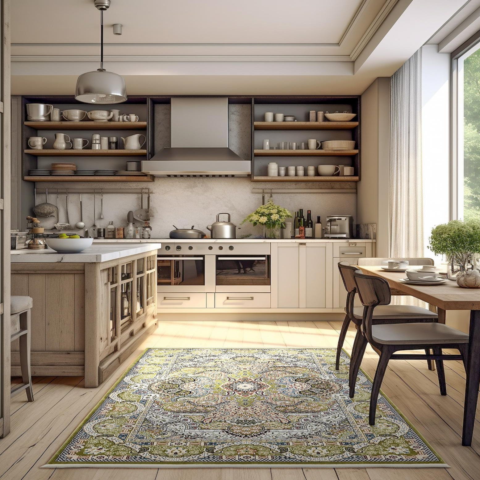 Primary color is Green. Colors in this rug include: Green, Blue, Burgundy, Cream, Ivory, Navy Blue, Plum Red, Tan.