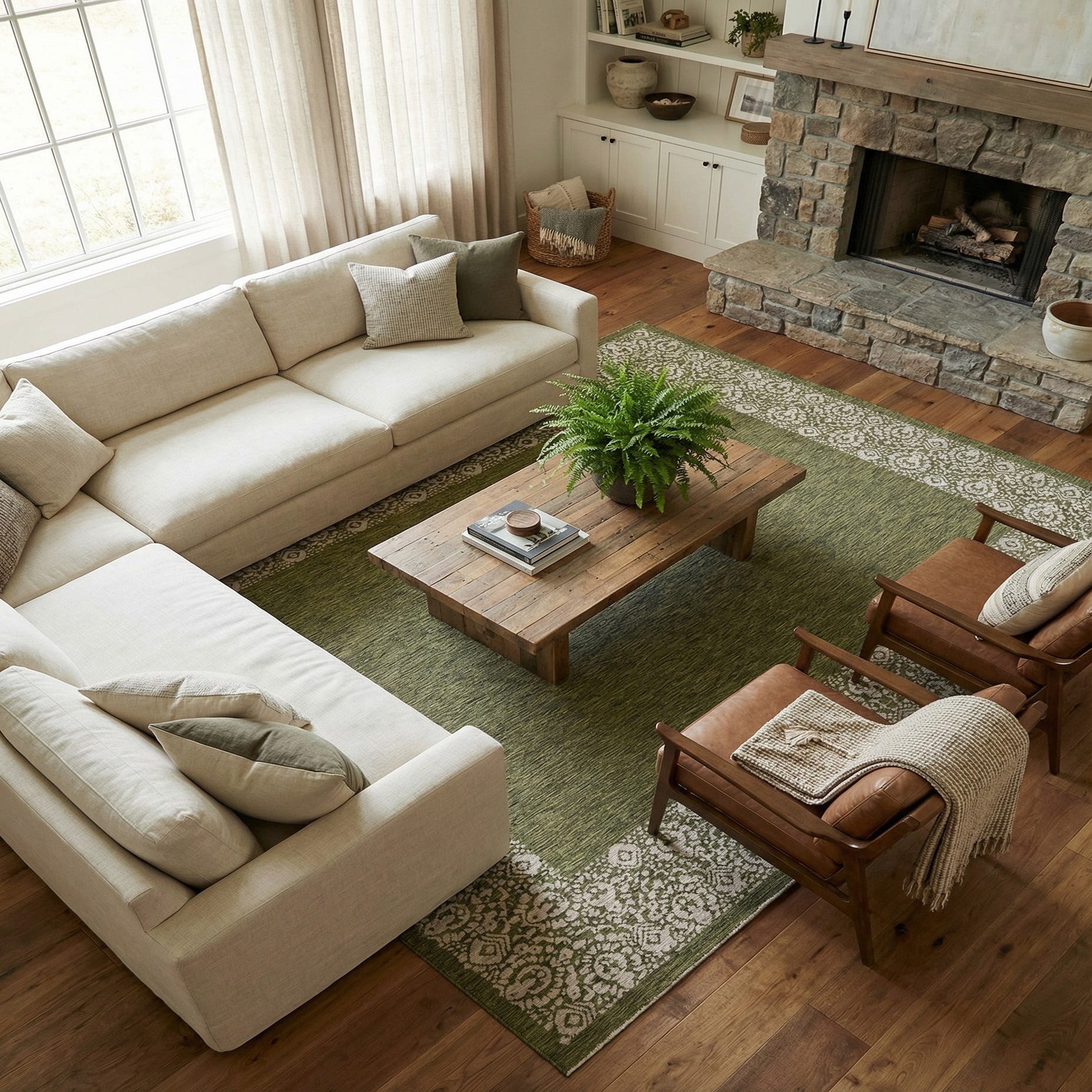 Primary color is Green. Colors in this rug include: Green, Gray, Ivory.
