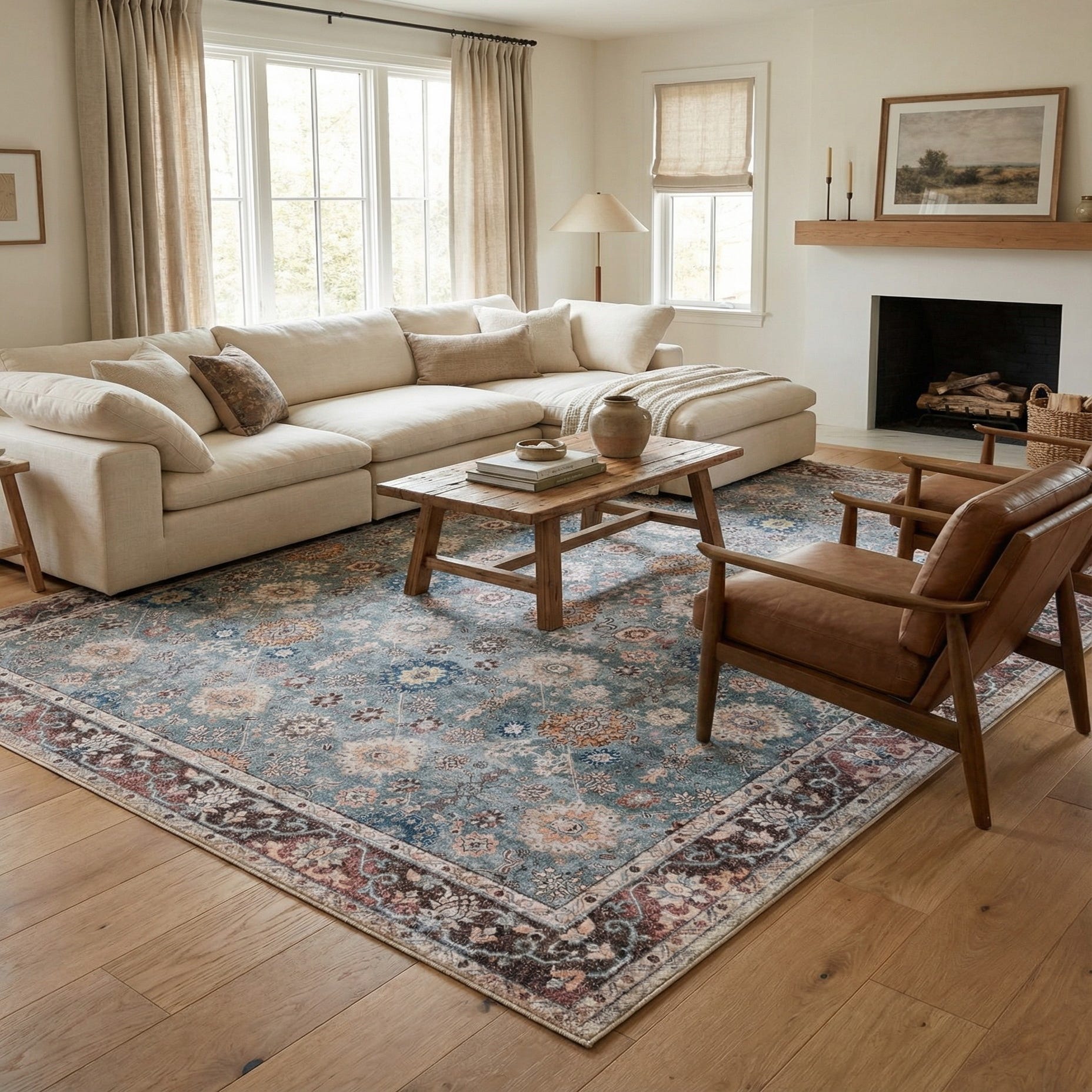 Primary color is Green. Colors in this rug include: Green, Black, Blue, Brown, Burgundy, Ivory, Navy Blue, Gold.