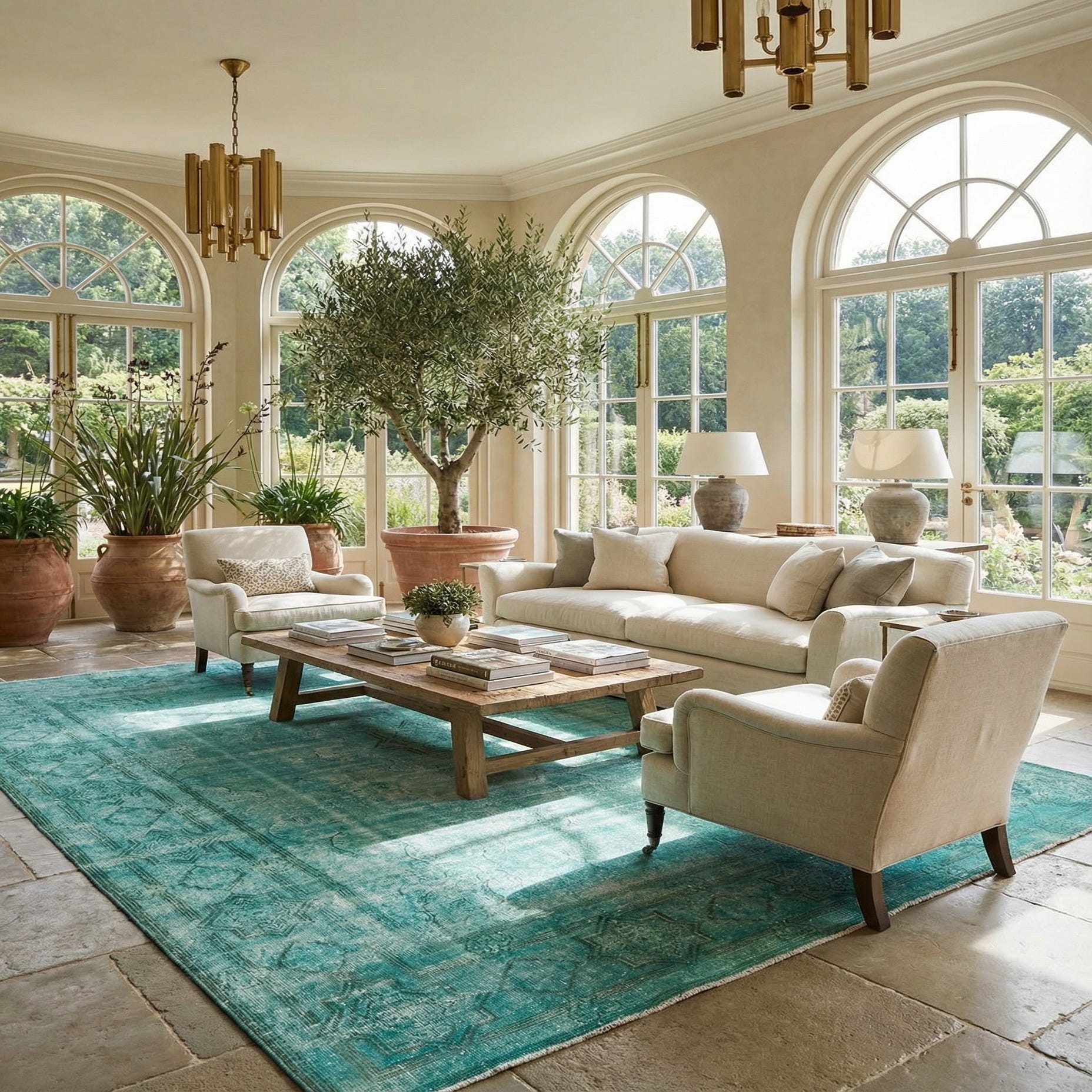 Primary color is Green. Colors in this rug include: Green, Green, Grey, Turquoise.