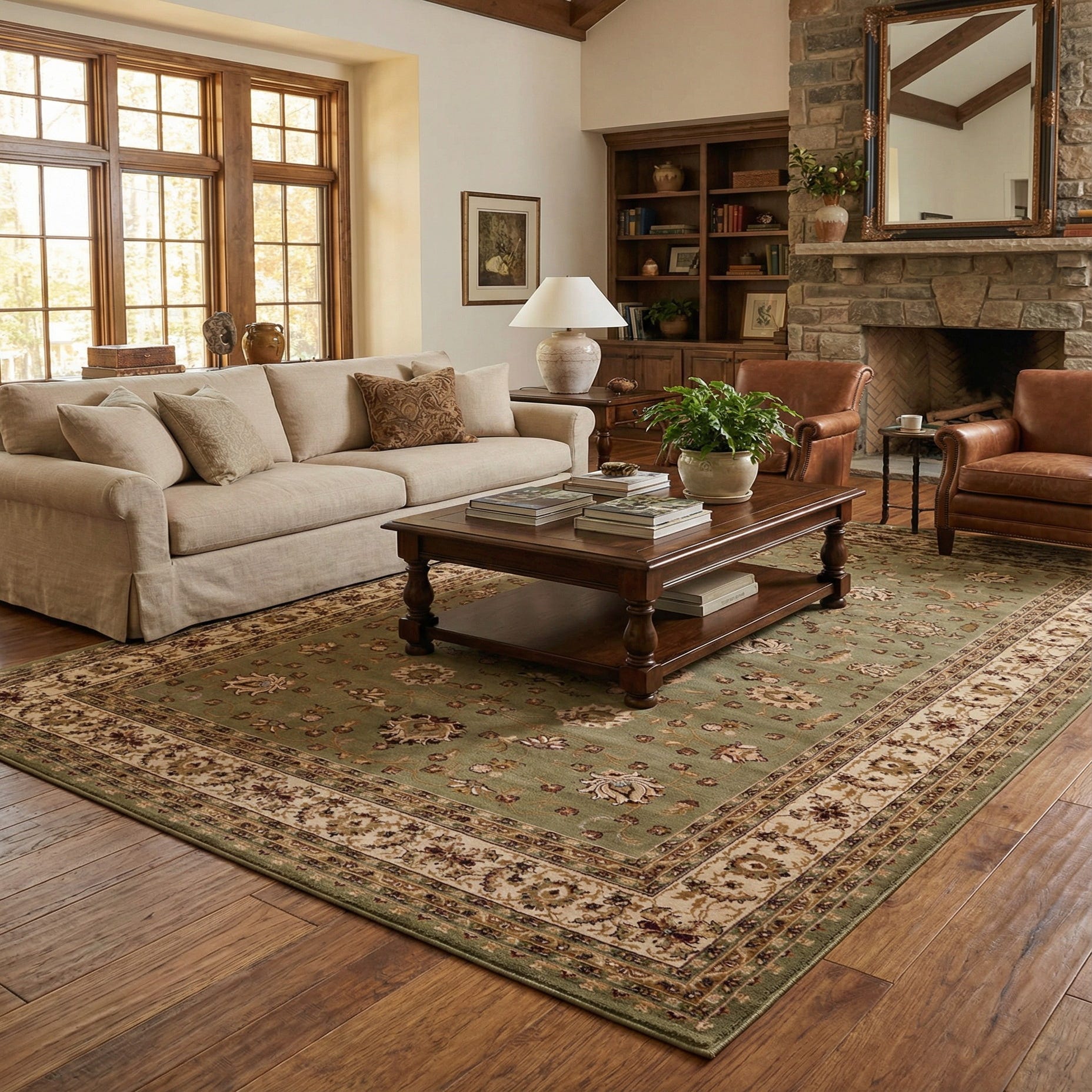 Primary color is Green. Colors in this rug include: Green, Cream, Light Blue, Red, Rust Red, Tan, Brown.