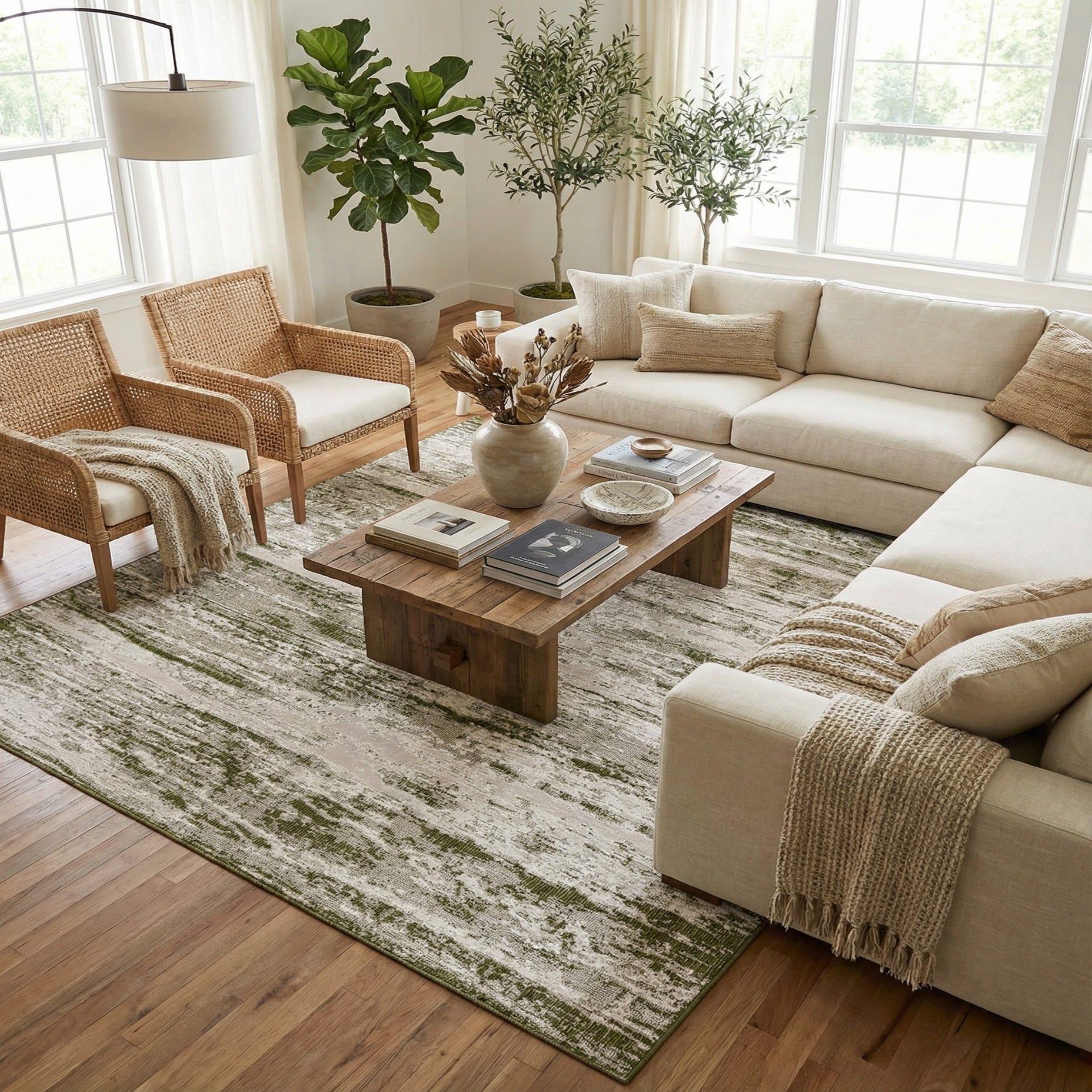 Primary color is Green. Colors in this rug include: Green, Ivory.