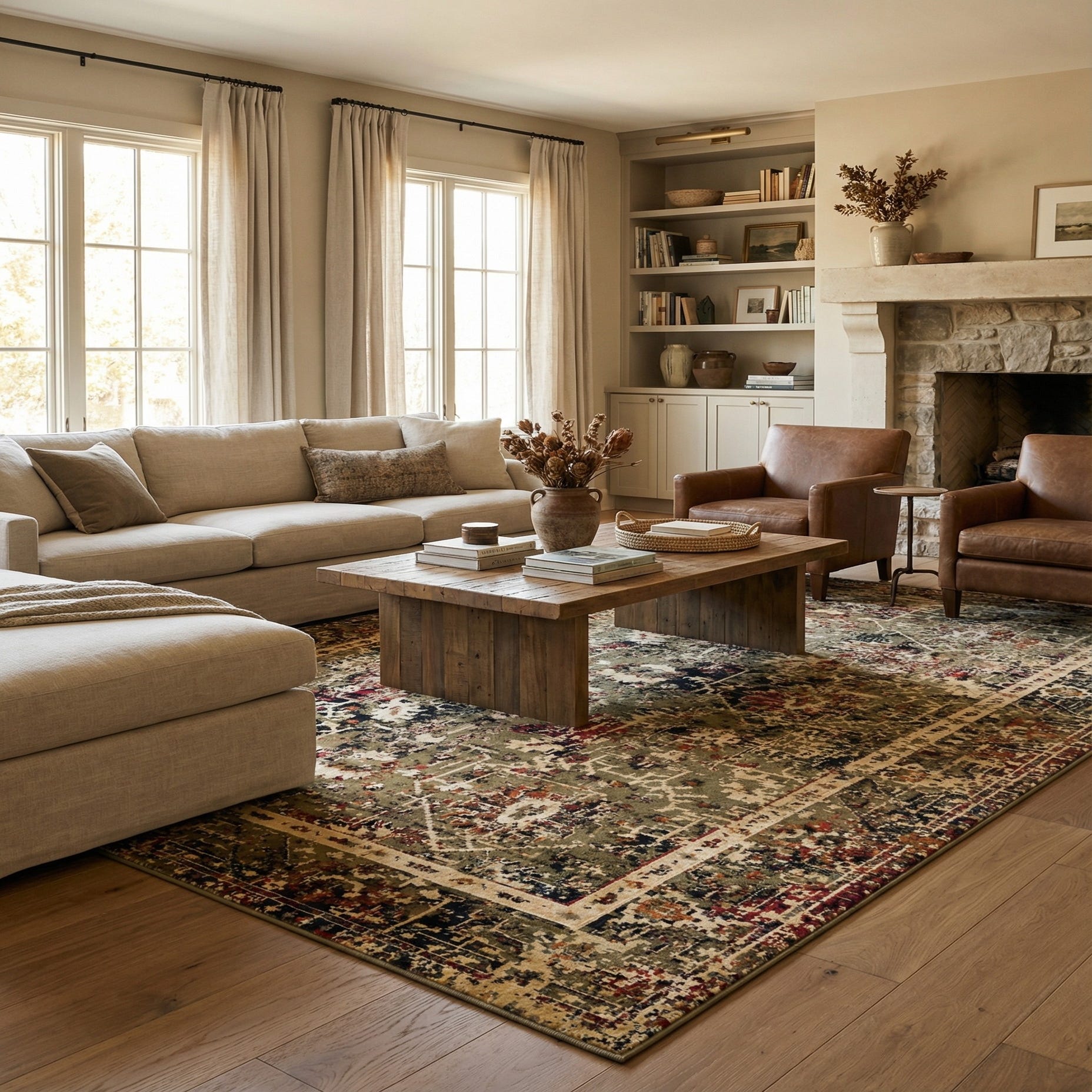 Primary color is Green. Colors in this rug include: Green, Beige, Black, Red.