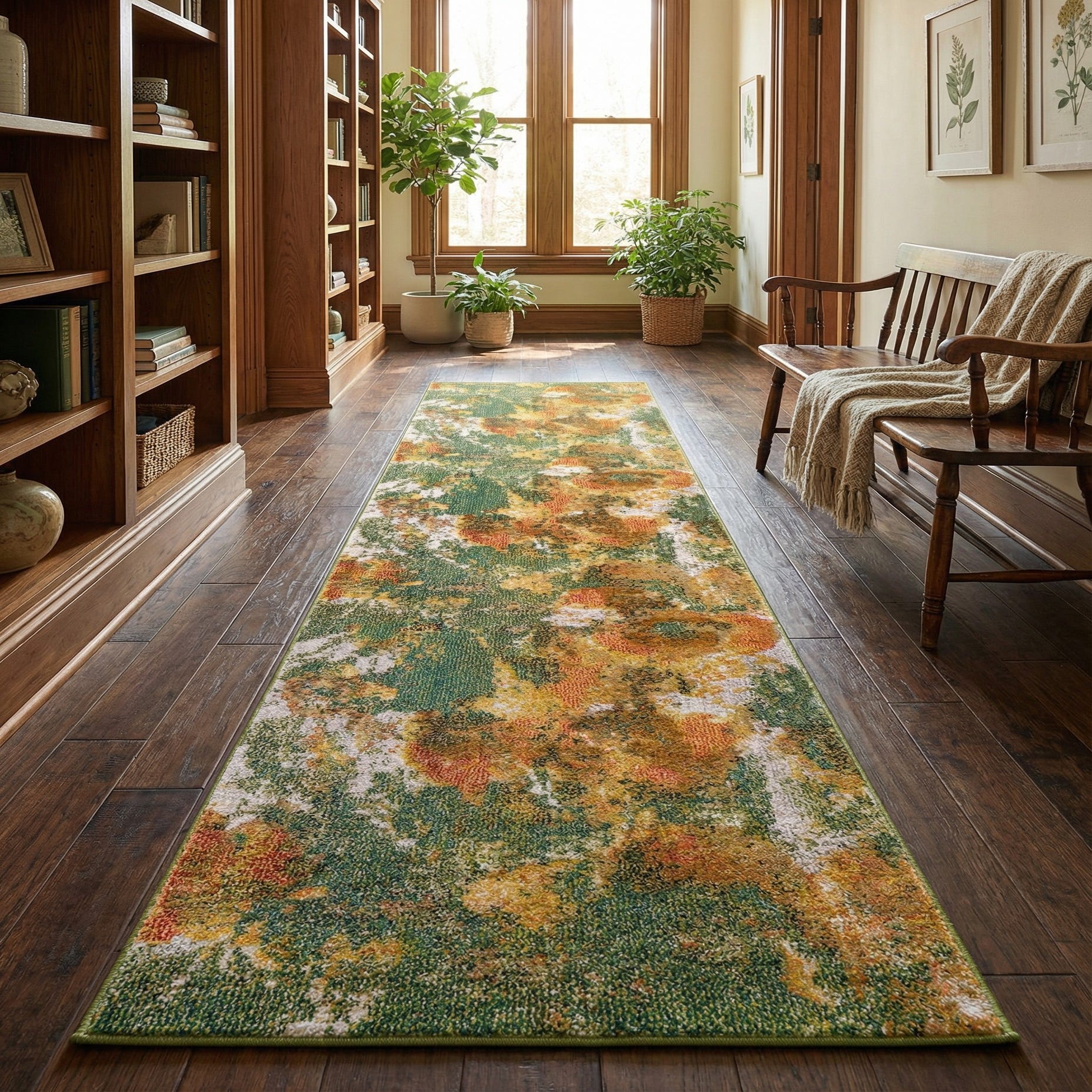 Primary color is Green. Colors in this rug include: Green, Gray, Ivory, Light Brown, Red, Yellow, Orange, Peach.