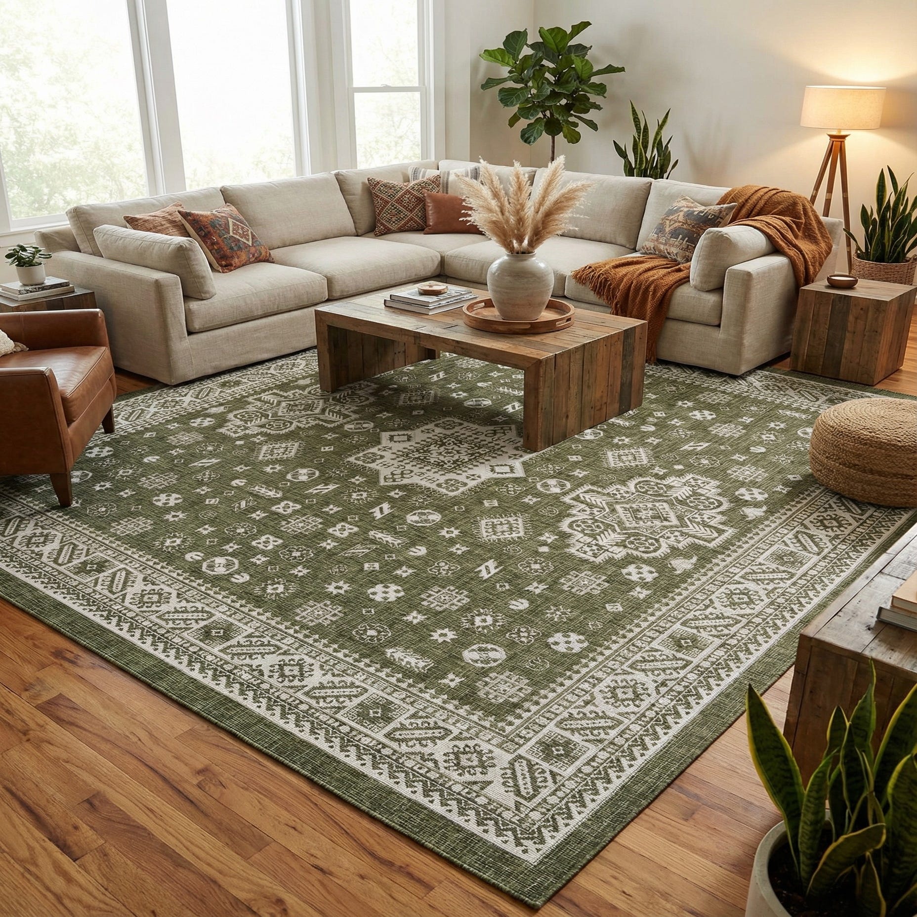 Primary color is Green. Colors in this rug include: Green, Ivory.