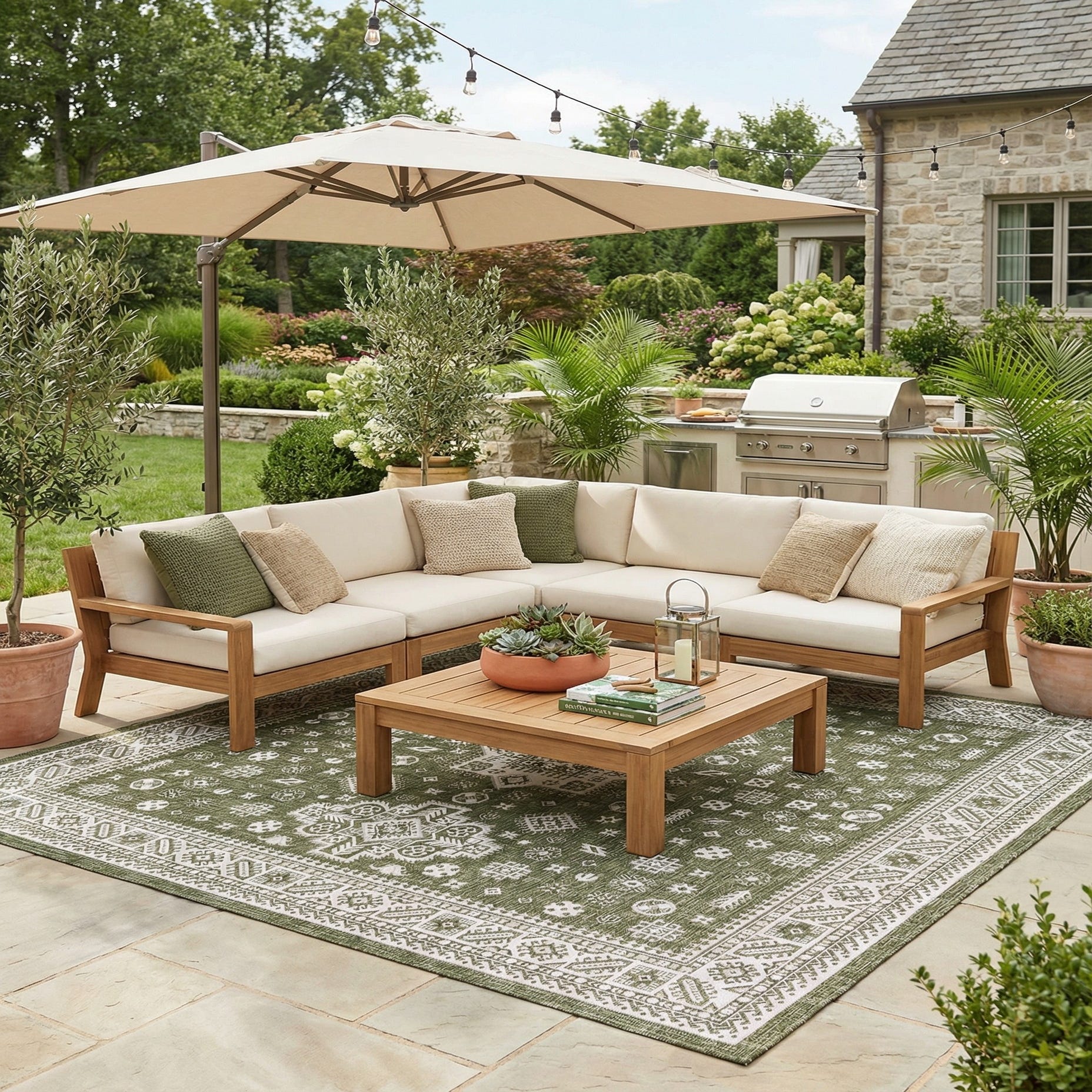 Primary color is Green. Colors in this rug include: Green, Ivory.