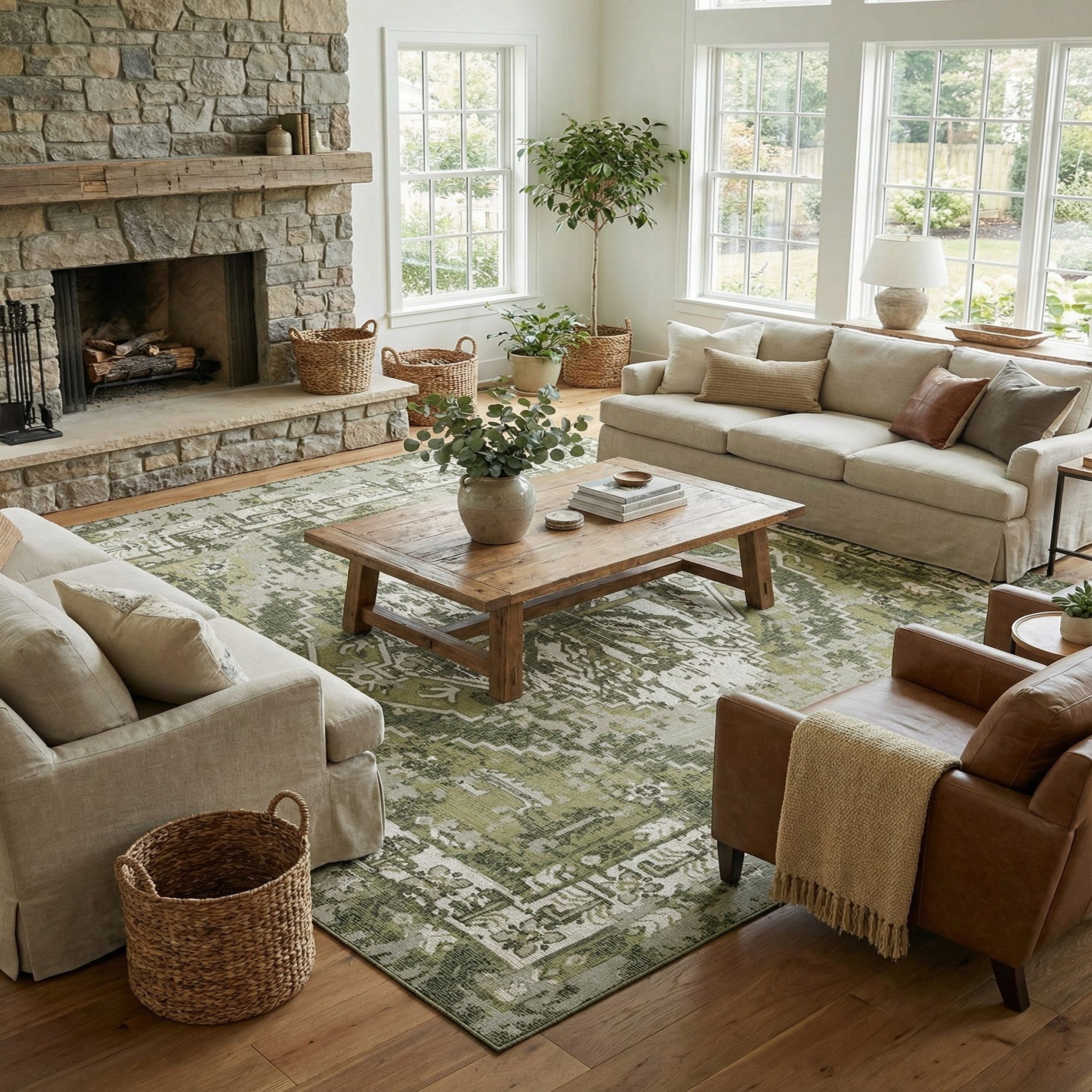 Primary color is Green. Colors in this rug include: Green, Ivory.