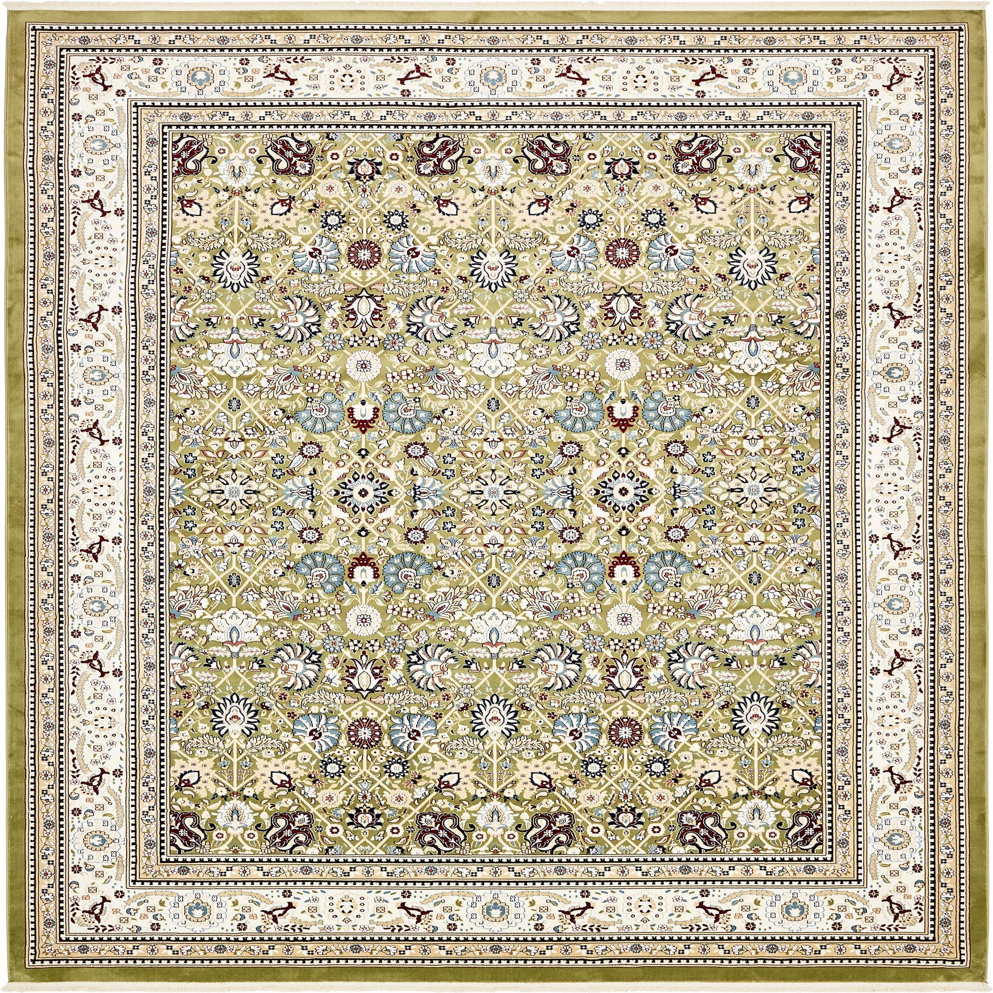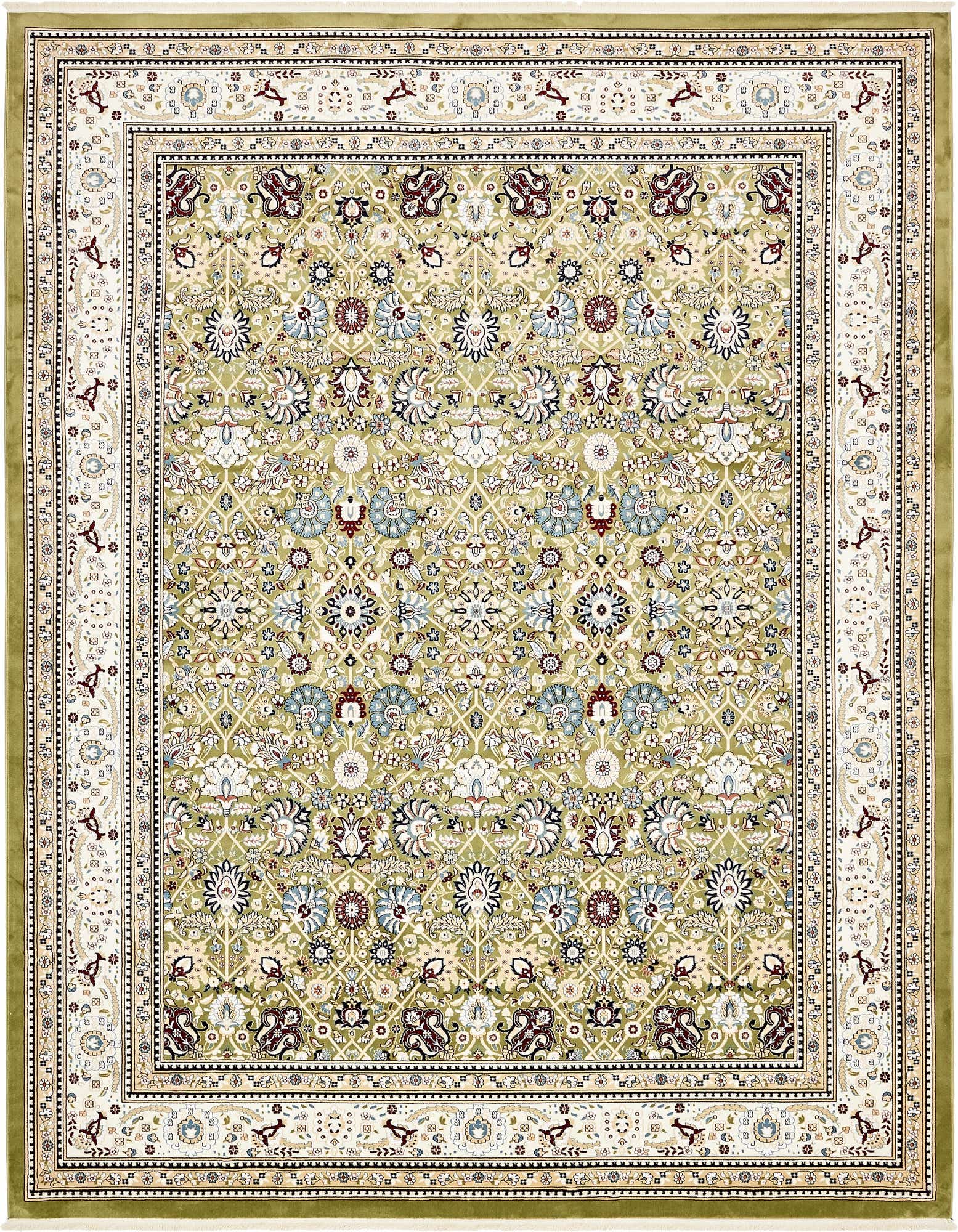 Primary color is Green. Colors in this rug include: Green, Blue, Burgundy, Cream, Ivory, Navy Blue, Plum Red, Tan.