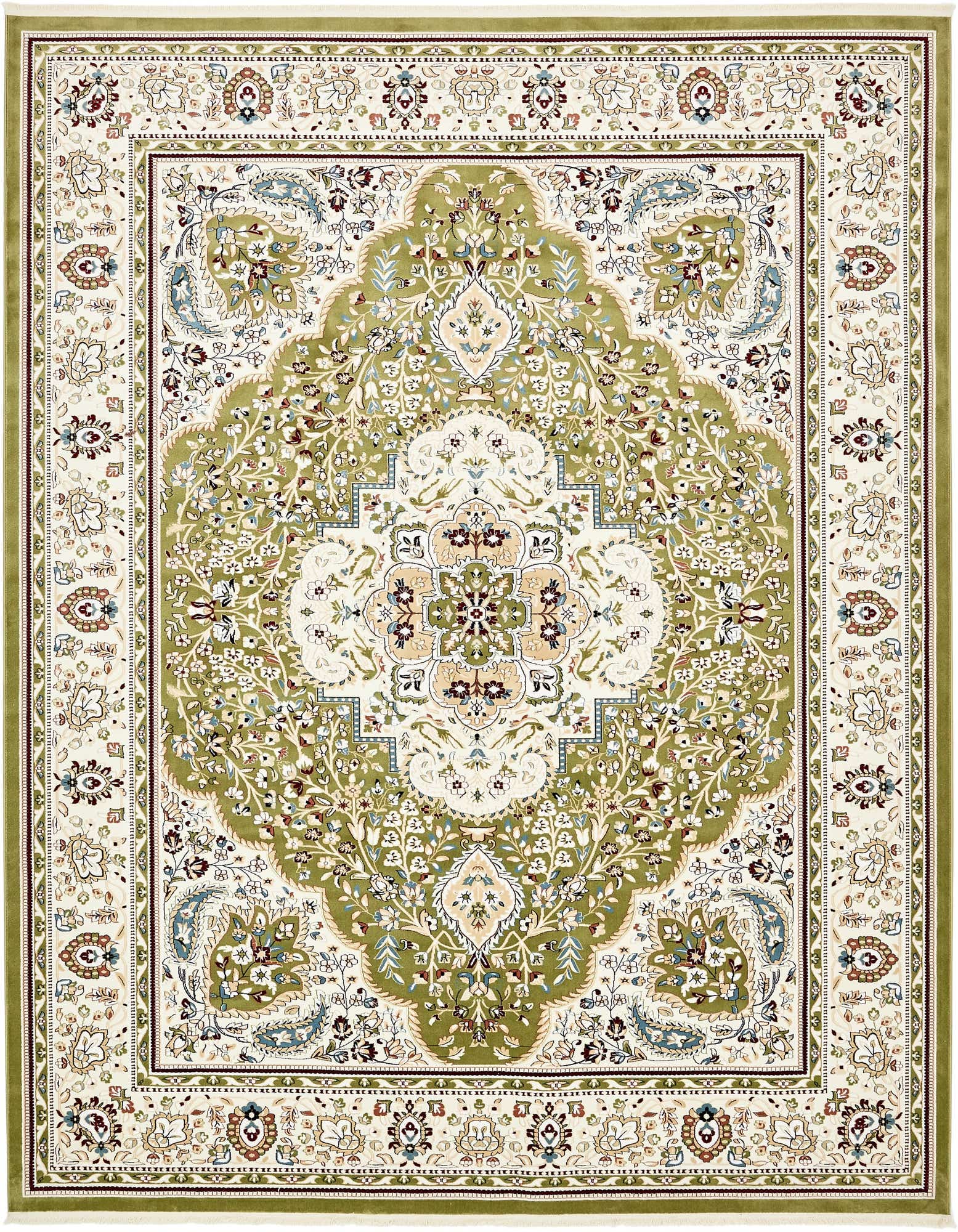 Primary color is Green. Colors in this rug include: Green, Black, Blue, Burgundy, Cream, Ivory, Navy Blue, Plum Red, Tan.