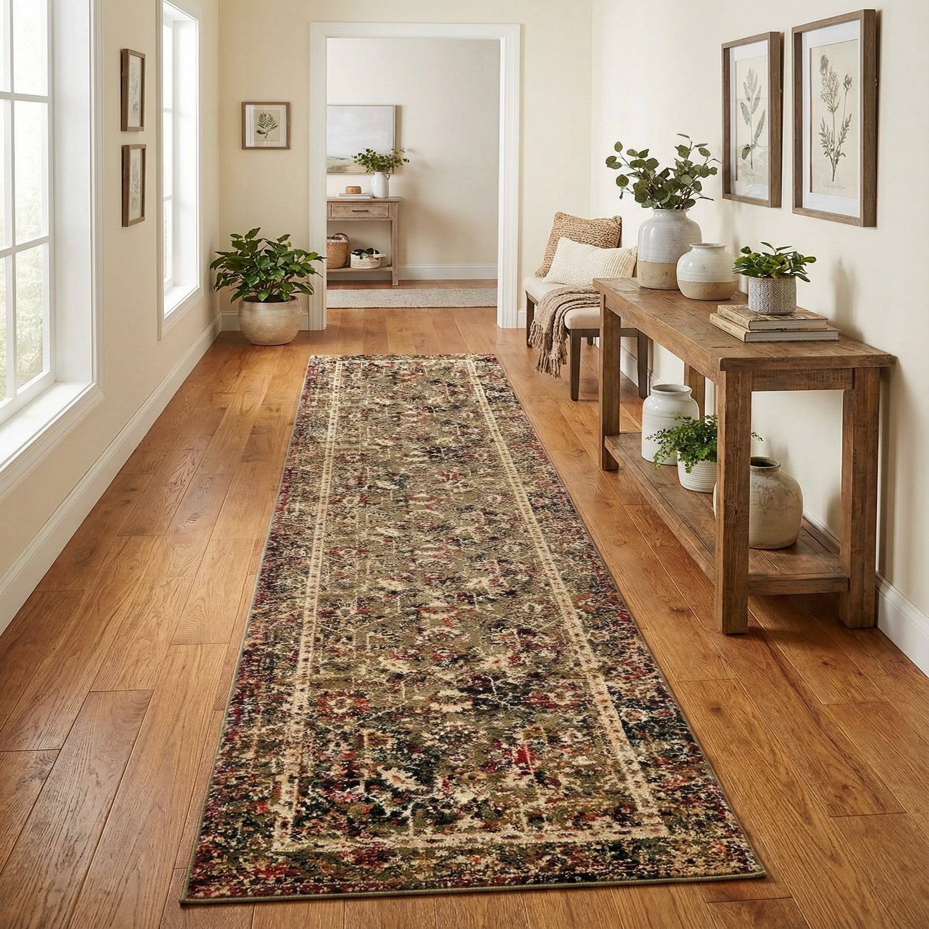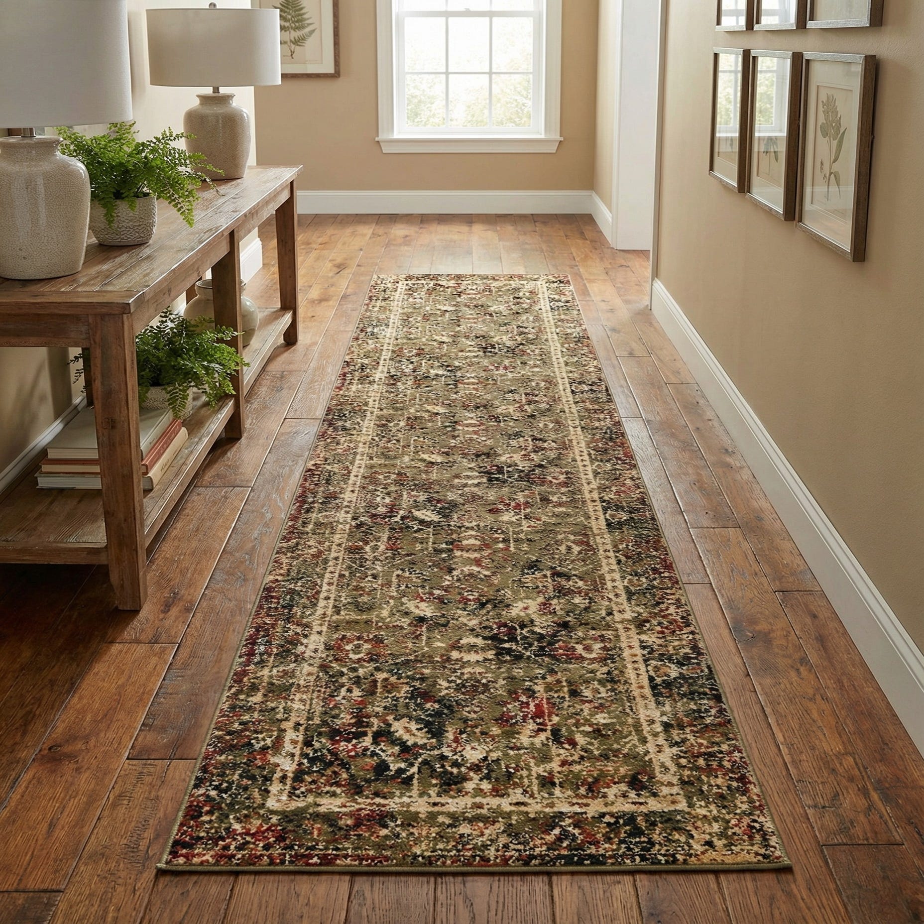 Primary color is Green. Colors in this rug include: Green, Beige, Black, Red.