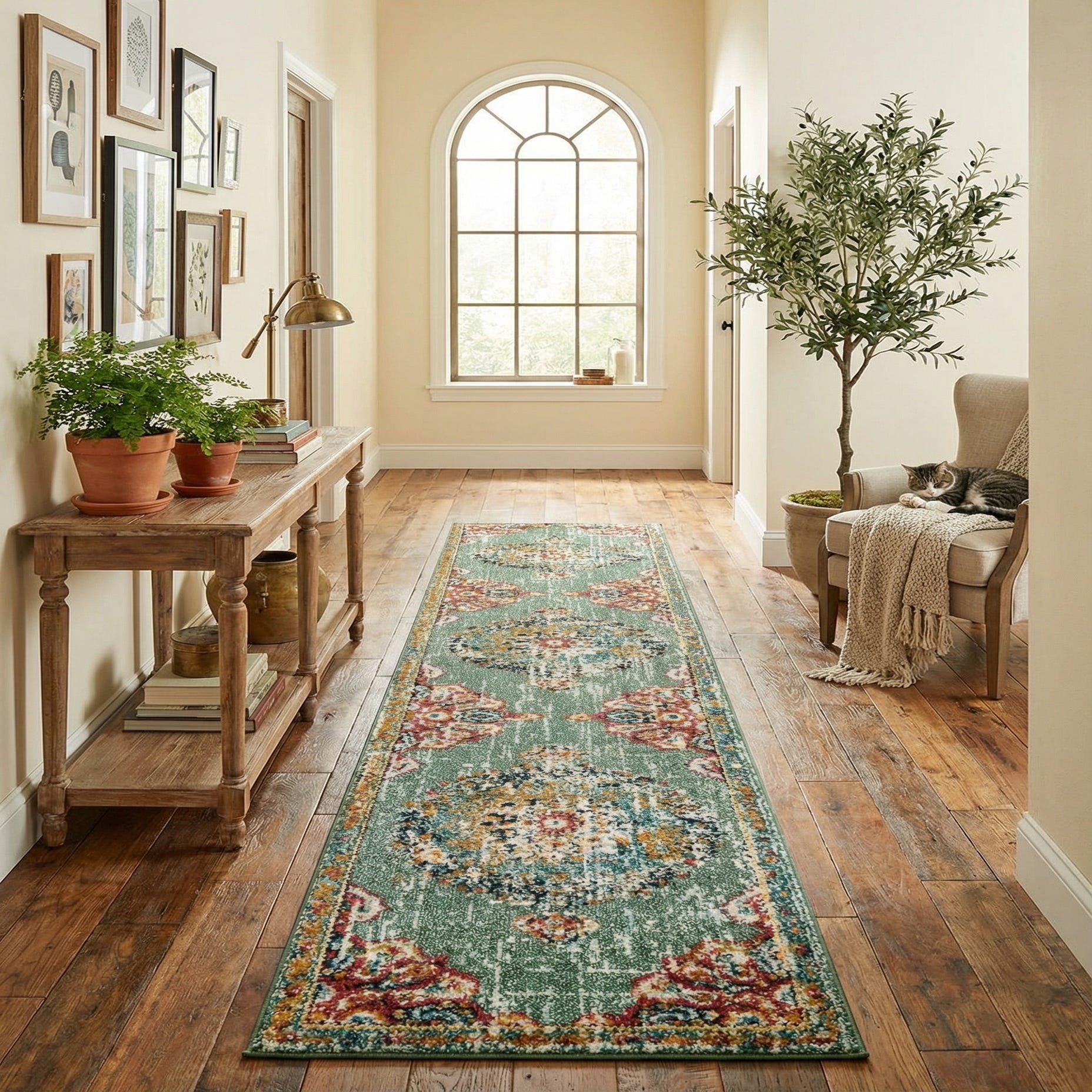 Primary color is Green. Colors in this rug include: Green, Beige, Blue, Ivory, Olive, Orange, Red, Yellow, Pink.