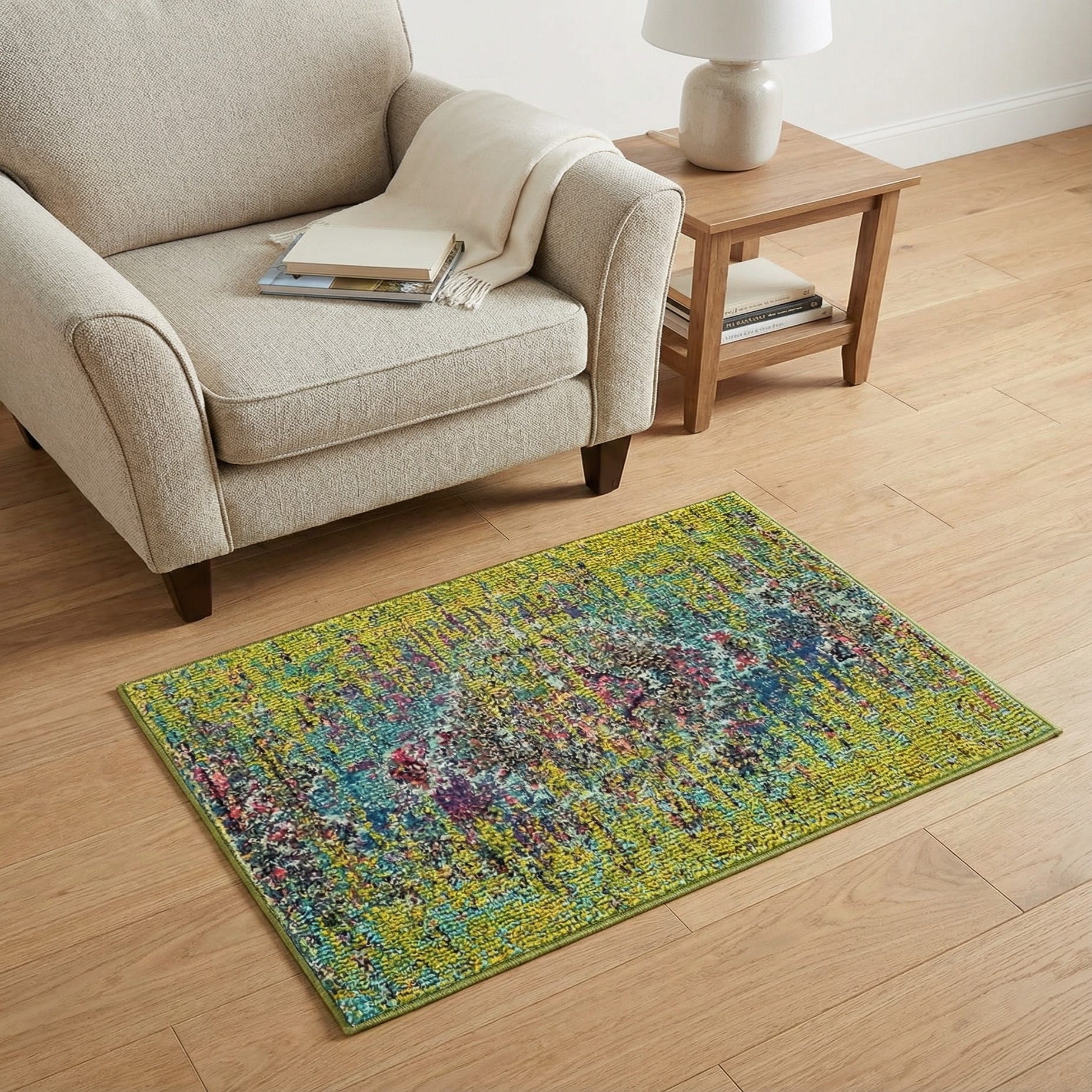Primary color is Green. Colors in this rug include: Green, Blue, Navy Blue, Pink, Brown, Yellow.