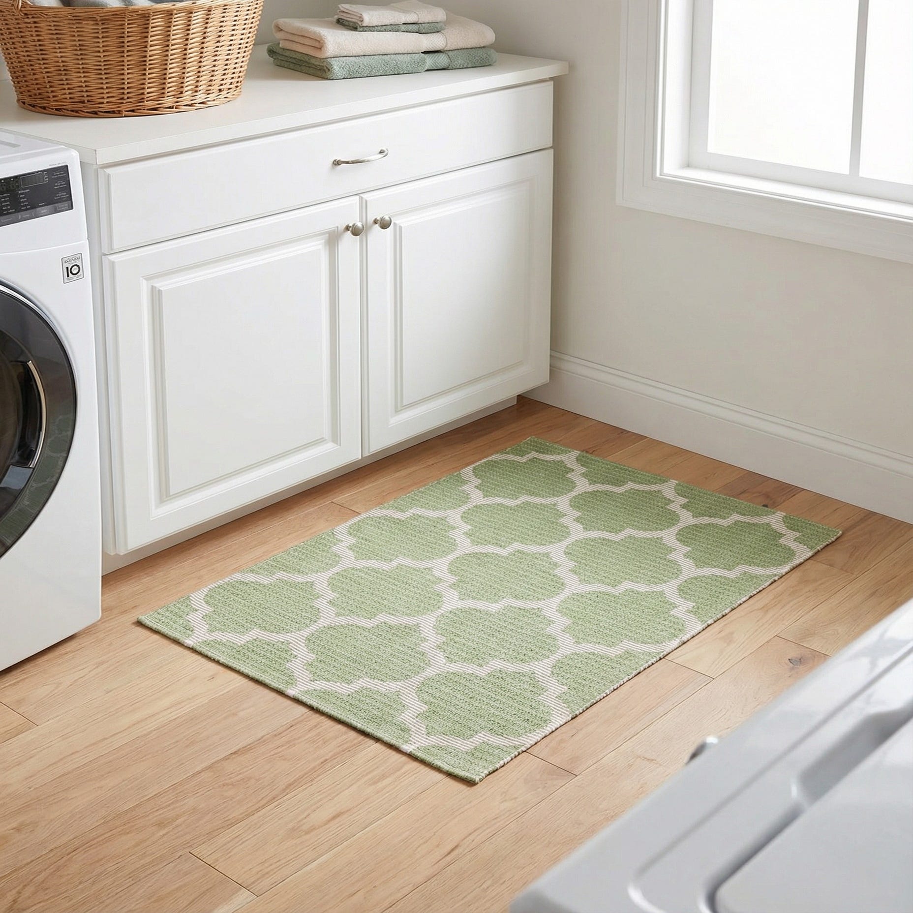 Primary color is Green. Colors in this rug include: Green, Ivory.