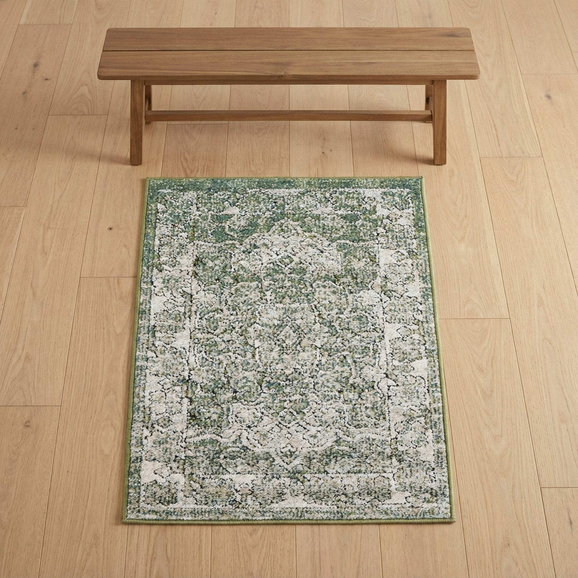 Primary color is Green. Colors in this rug include: Green, Gray, Ivory, Black, Blue.