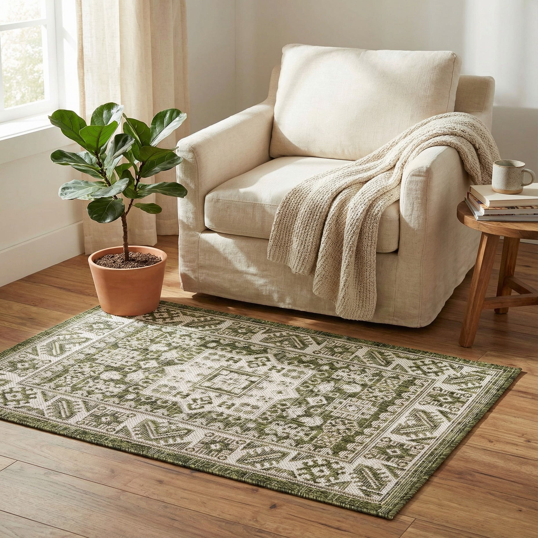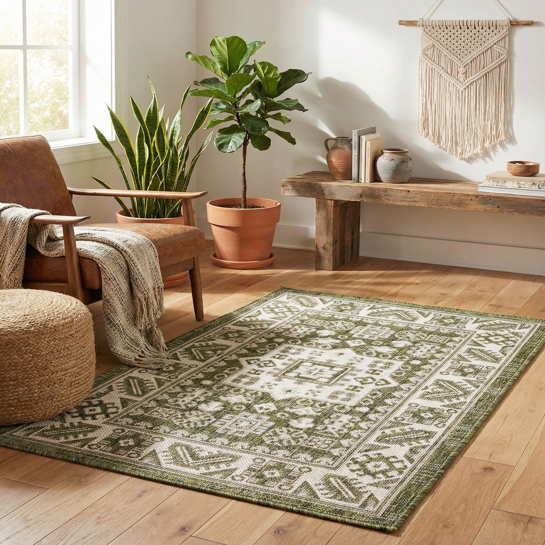 Primary color is Green. Colors in this rug include: Green, Ivory.