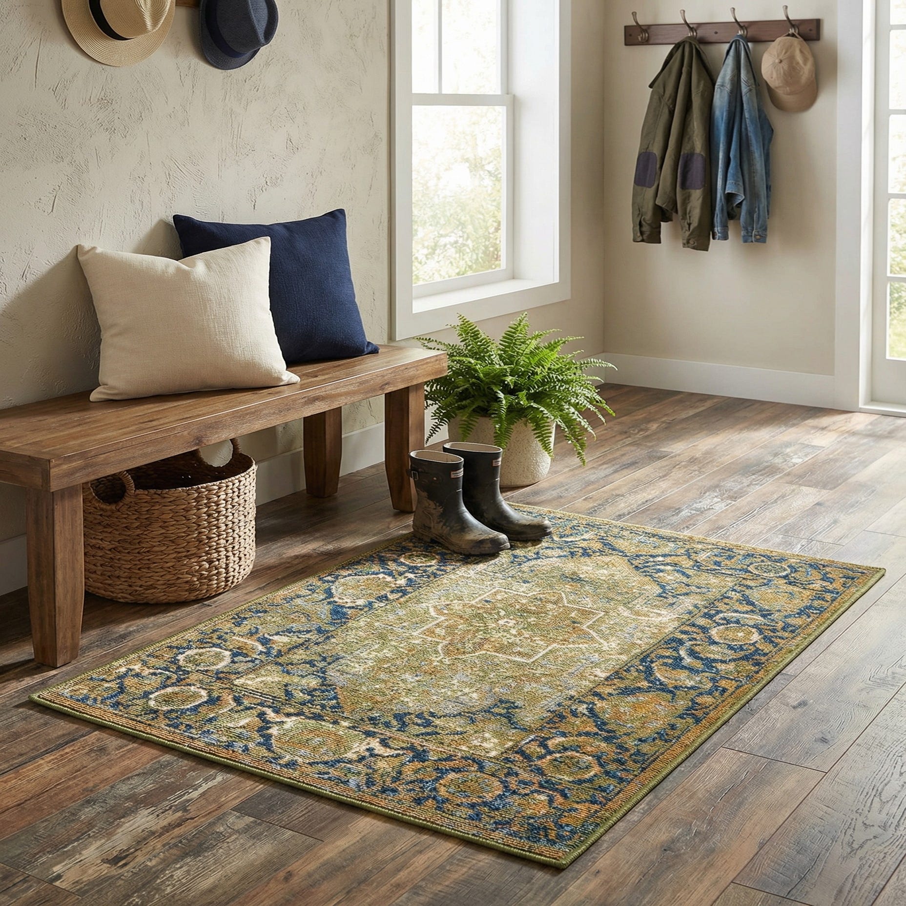 Primary color is Green. Colors in this rug include: Green, Beige, Light Blue, Light Brown, Olive, Terracotta.