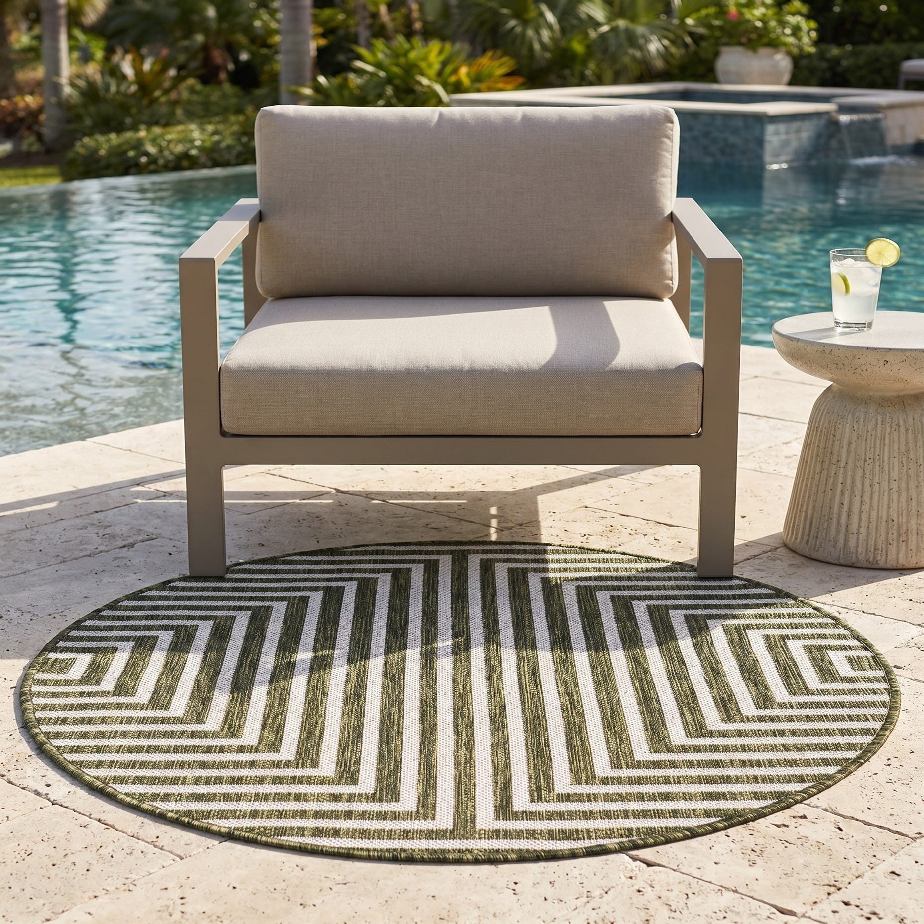 Love the contemporary look of this rug! We are so happy we chose this to accent the blue of our pool with our living area on our lanai. We still are going to add a few more pillows but love the rug to add color.