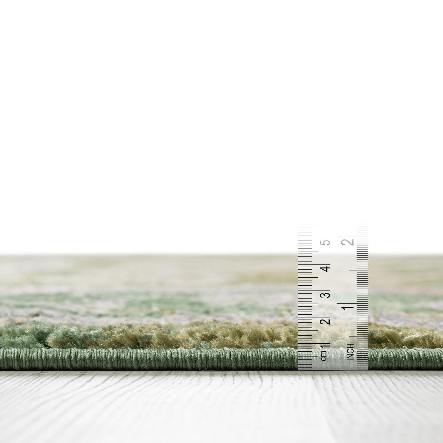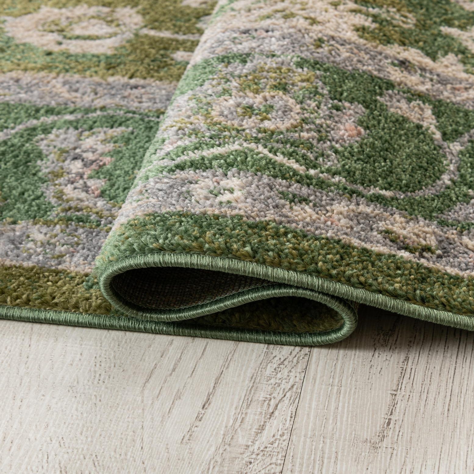 Primary color is Green. Colors in this rug include: Green, Gray, Ivory, Hunter Green, Pink.