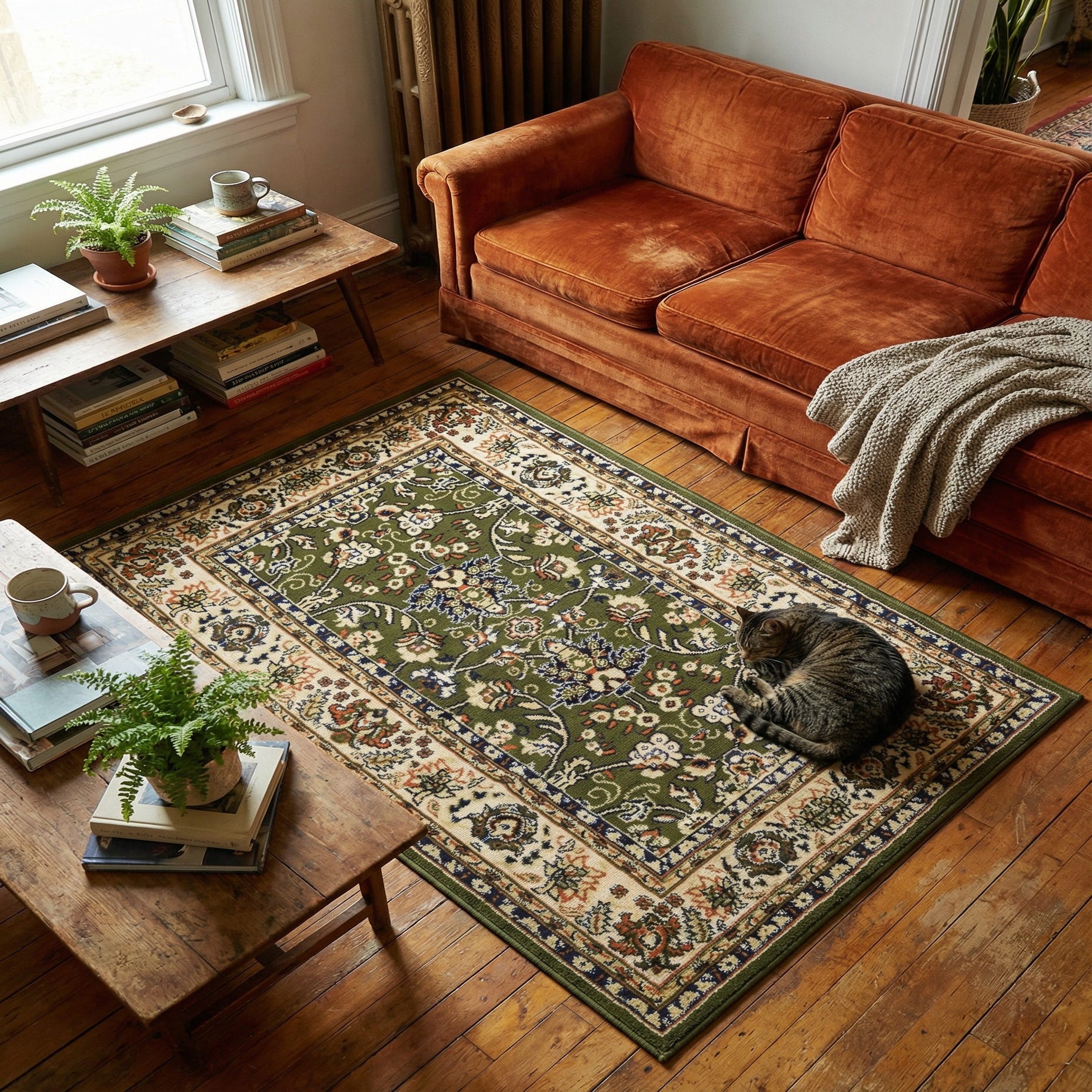Primary color is Green. Colors in this rug include: Green, Cream, Navy Blue, Terracotta.