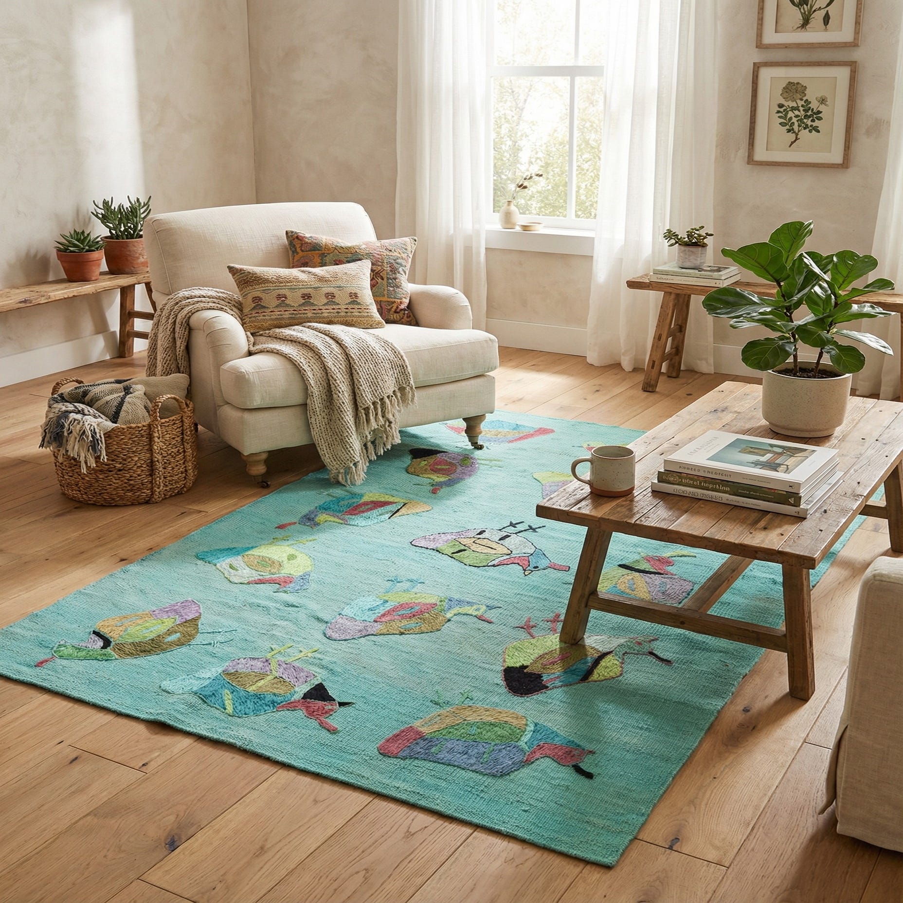 Primary color is Green. Colors in this rug include: Green, Black, Blue, Light Green, Olive, Violet, Red.