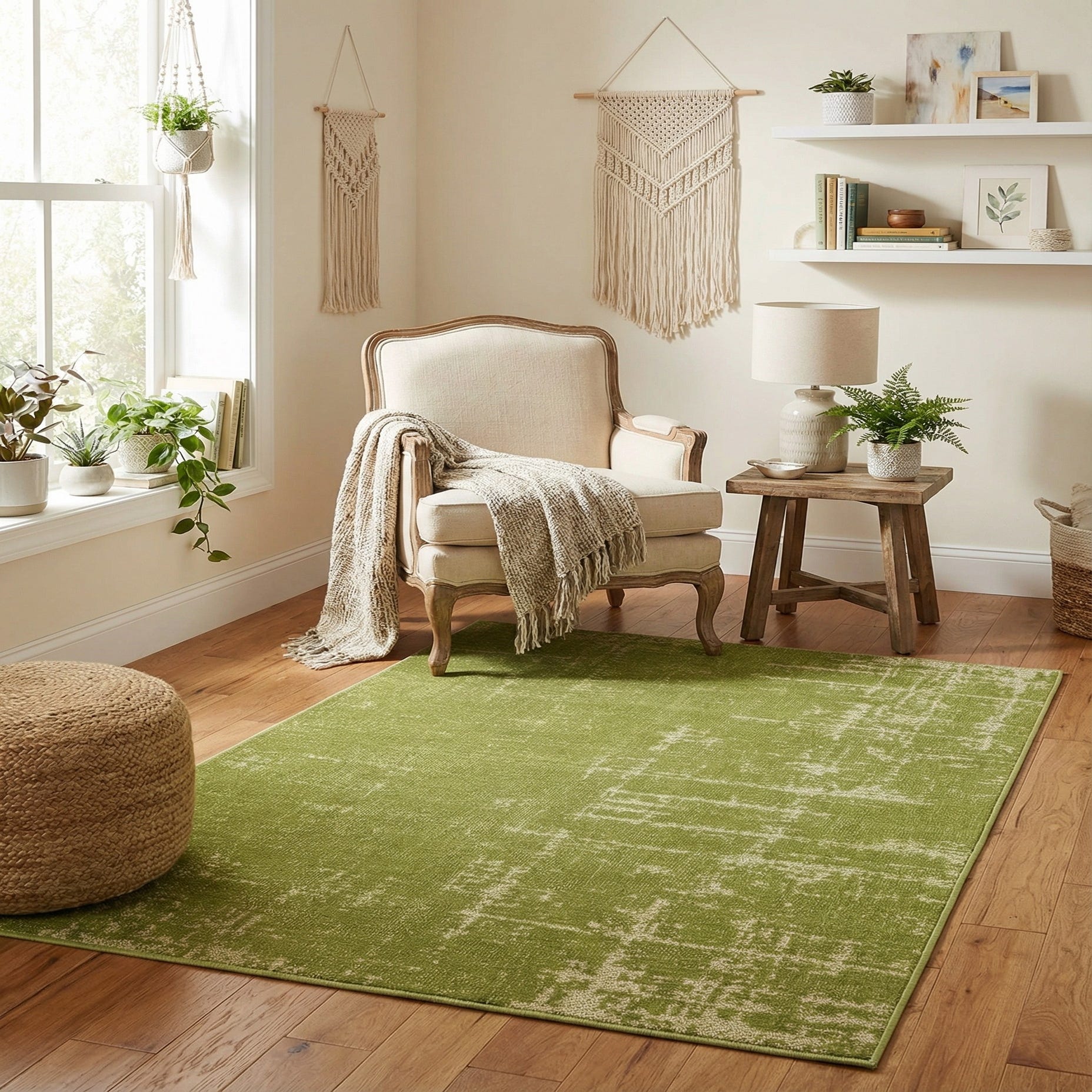Primary color is Green. Colors in this rug include: Green, Ivory.