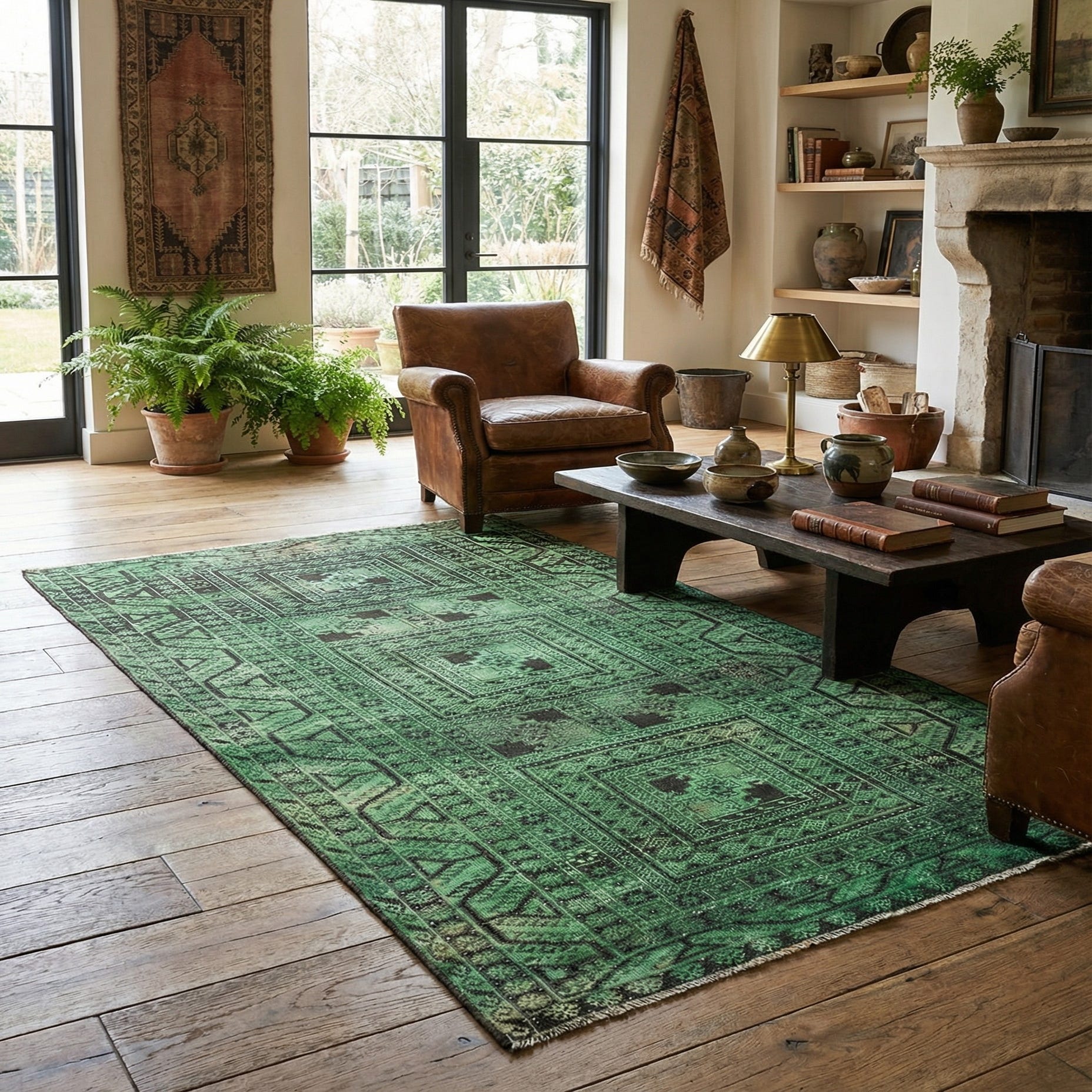 Primary color is Green. Colors in this rug include: Green, Brown.