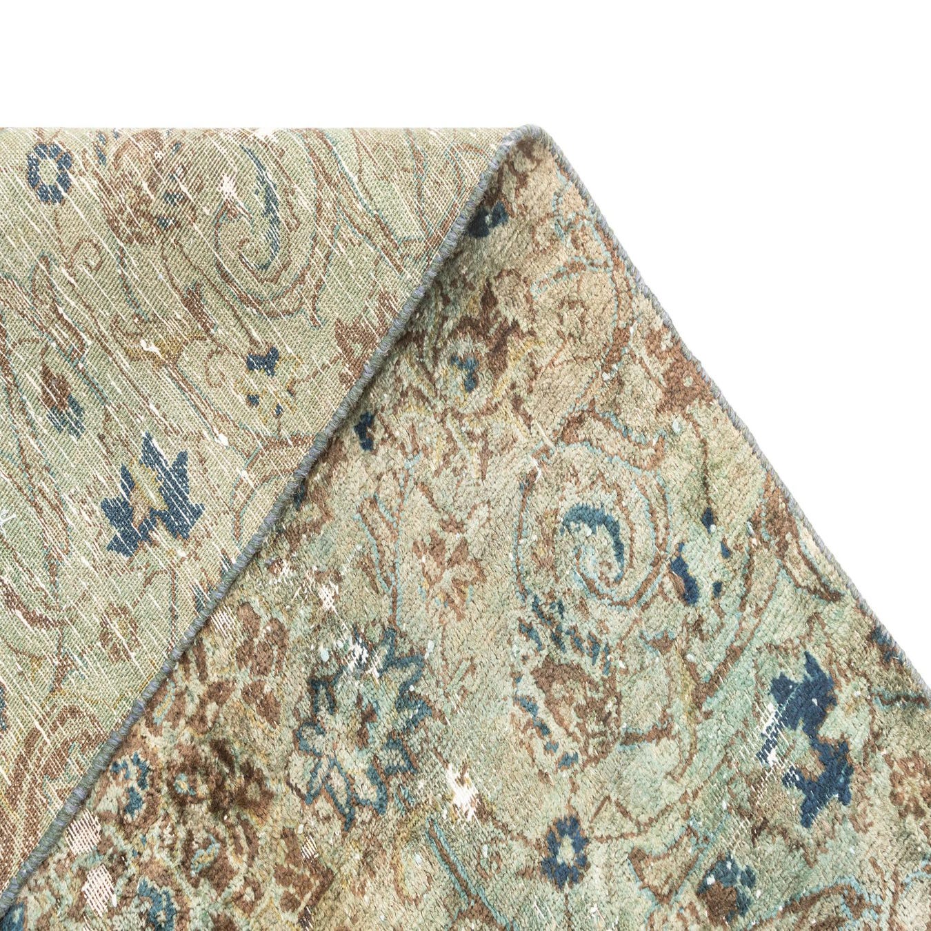Primary color is Green. Colors in this rug include: Green, Brown, Blue.