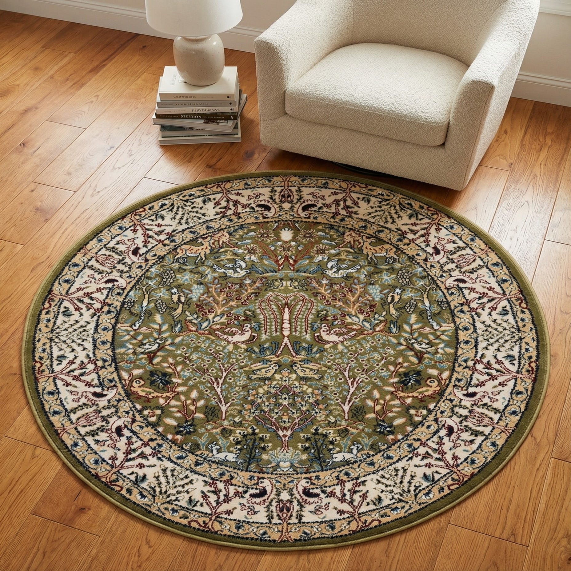 Primary color is Green. Colors in this rug include: Green, Beige, Blue, Burgundy, Cream, Ivory, Navy Blue, Puce.