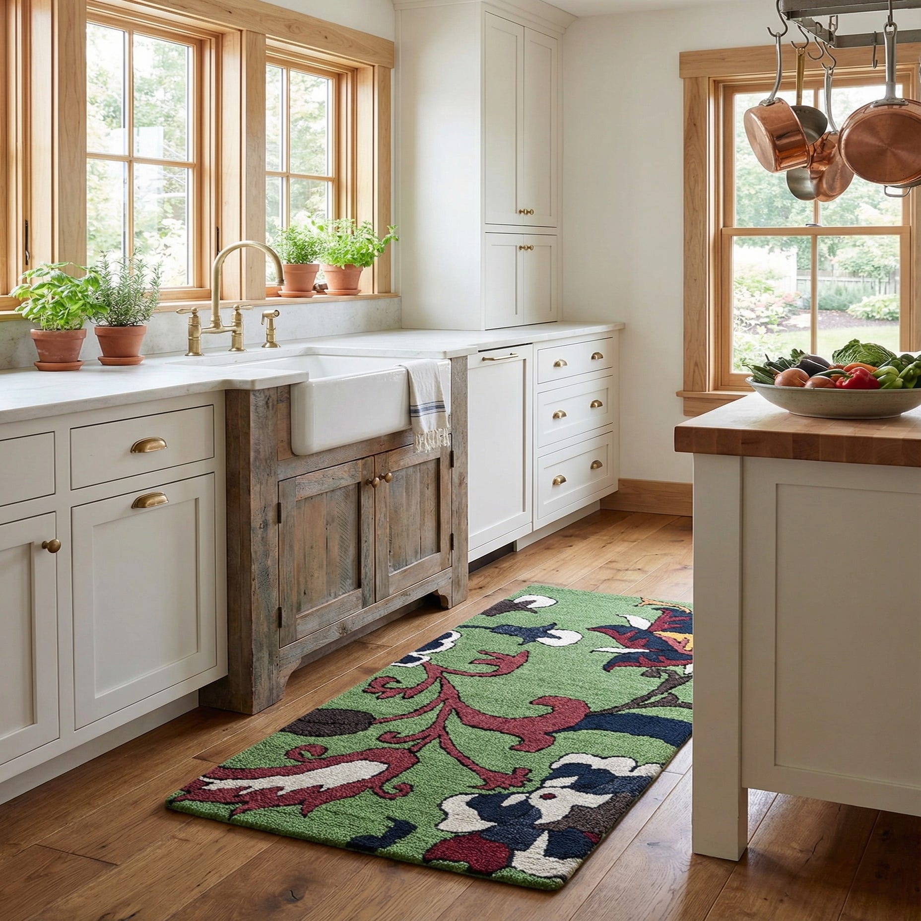 Primary color is Green. Colors in this rug include: Green, Black, Ivory, Red, Gold, Maroon.