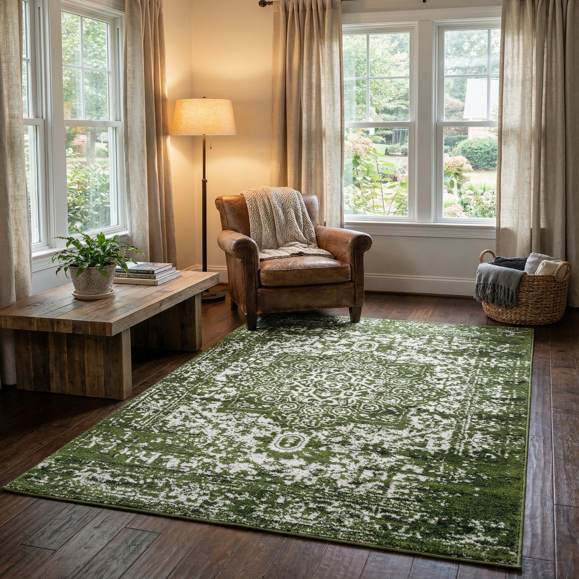 Primary color is Green. Colors in this rug include: Green, Ivory.