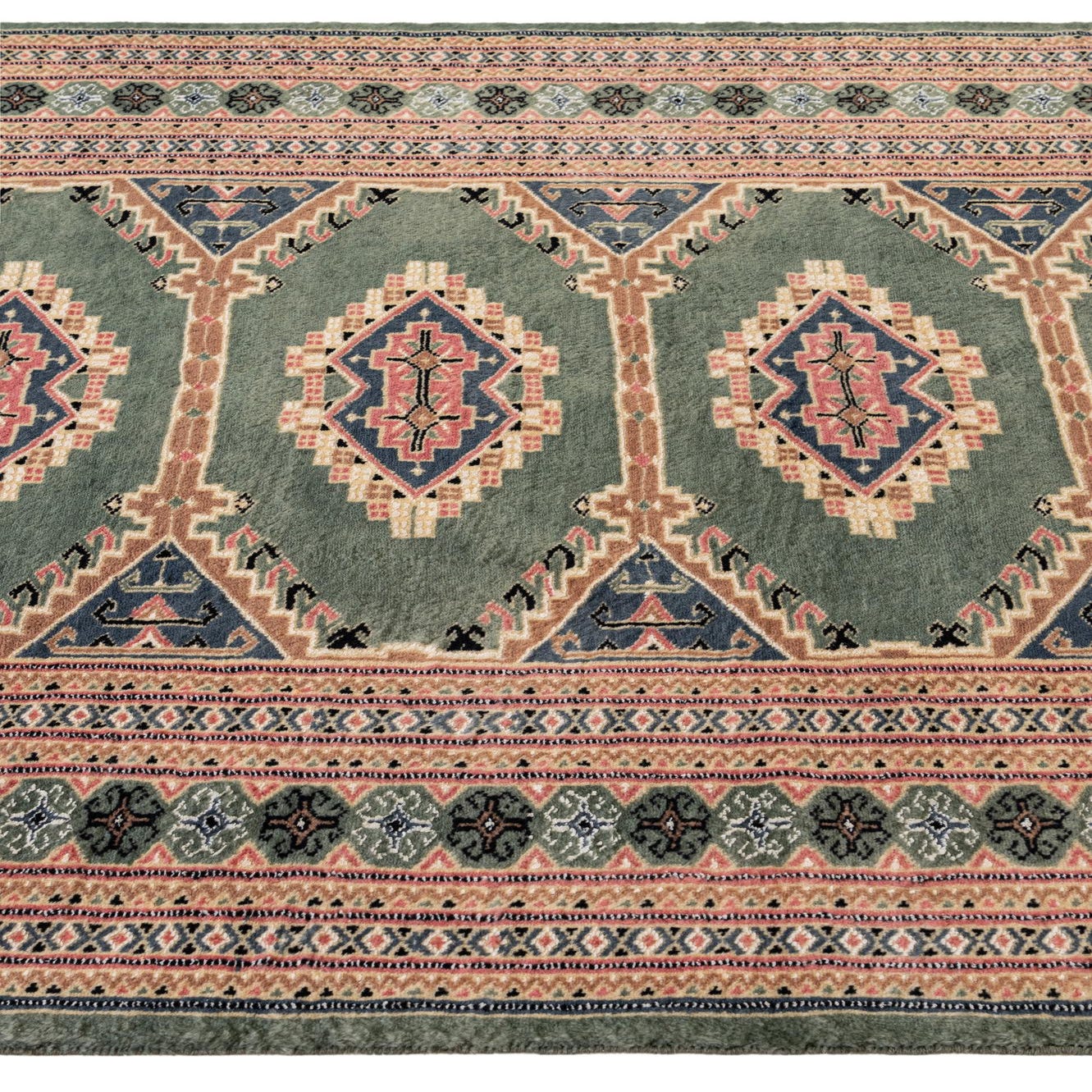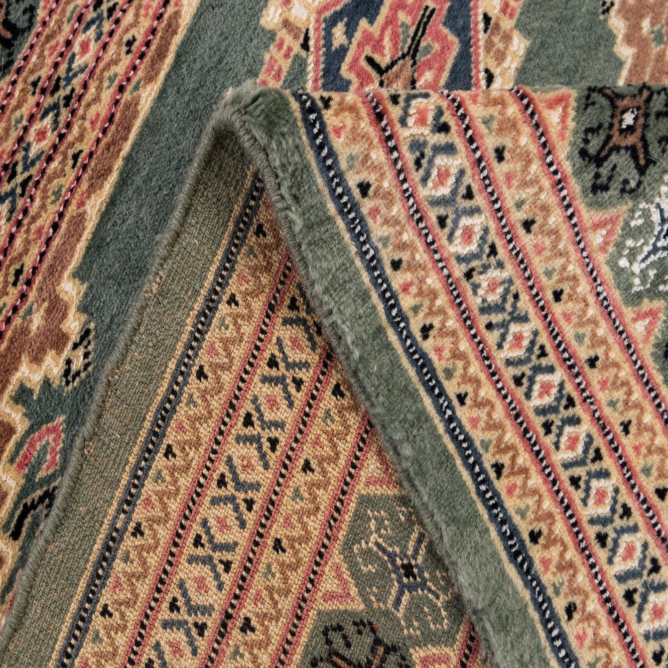 Primary color is Green. Colors in this rug include: Green, Black, Blue, Brown, Ivory, Navy Blue, Pink.