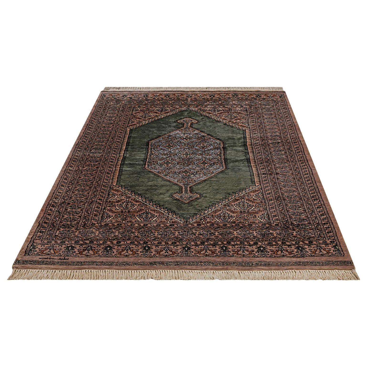 Primary color is Green. Colors in this rug include: Green, Beige, Black, Blue, Brown, Ivory, Light Blue.
