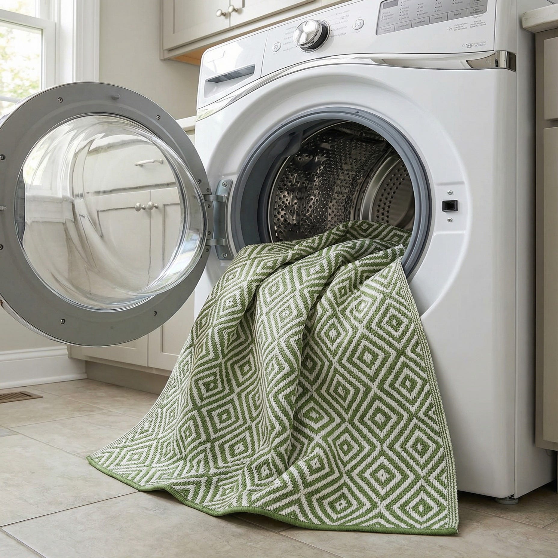 Primary color is Green. Colors in this rug include: Green, Ivory.