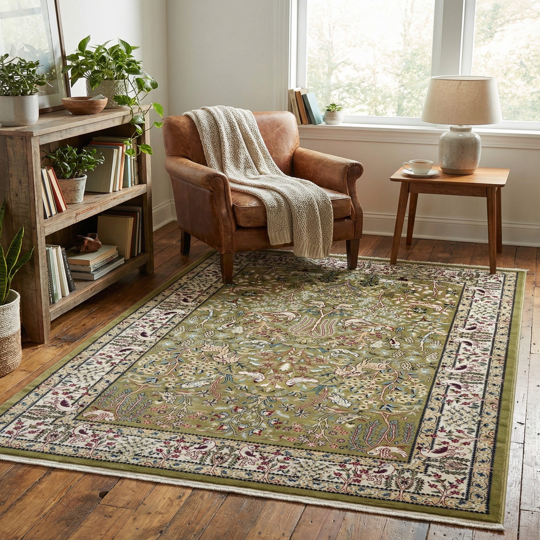 Primary color is Green. Colors in this rug include: Green, Beige, Blue, Burgundy, Cream, Ivory, Puce, Navy Blue.