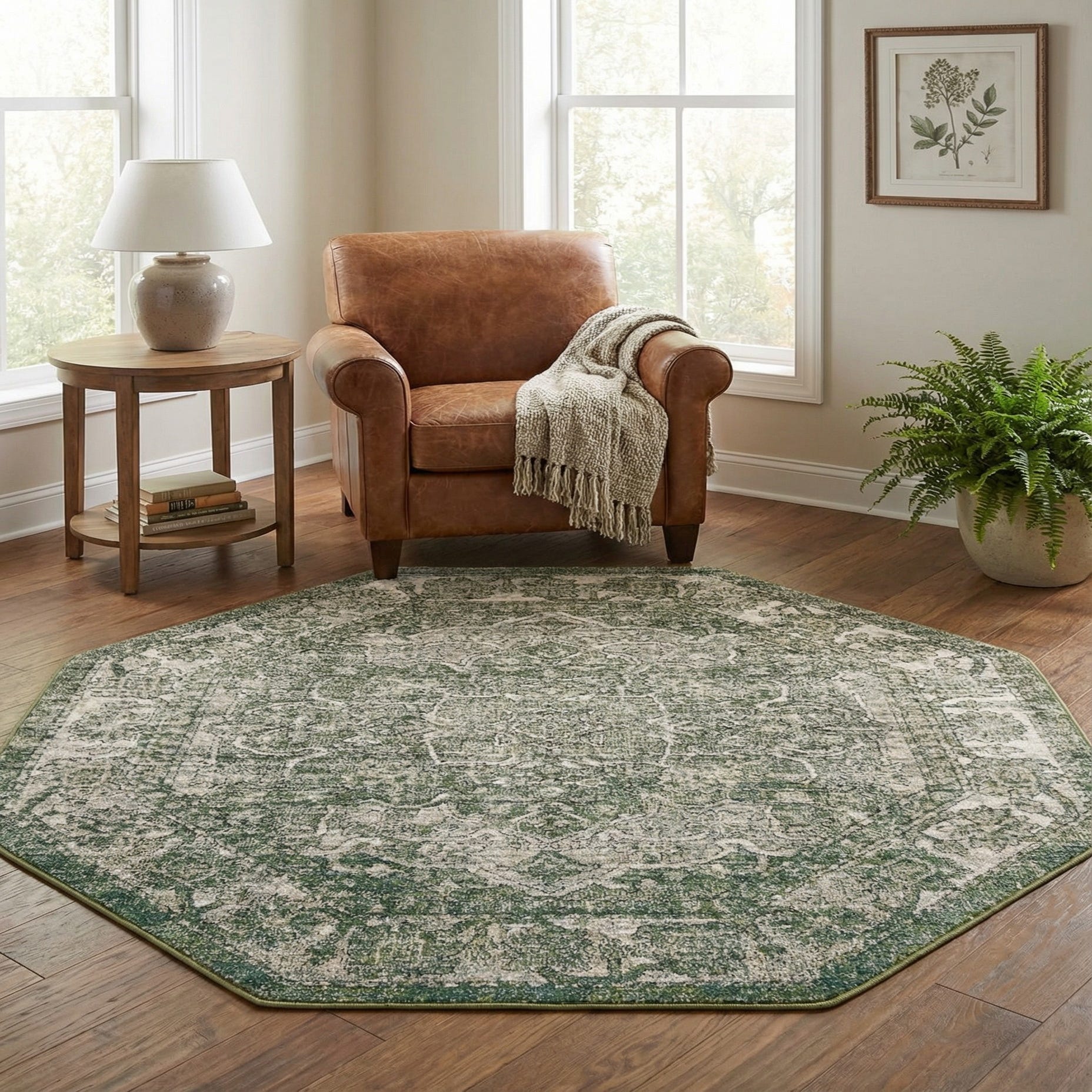 Primary color is Green. Colors in this rug include: Green, Gray, Ivory, Black, Blue.